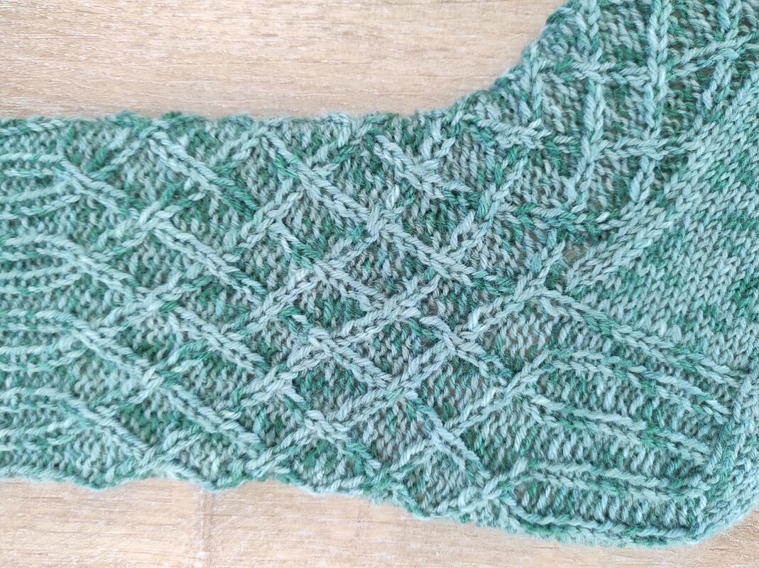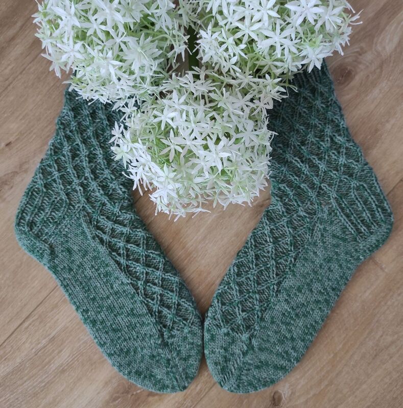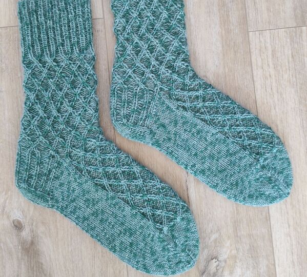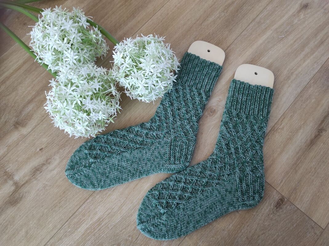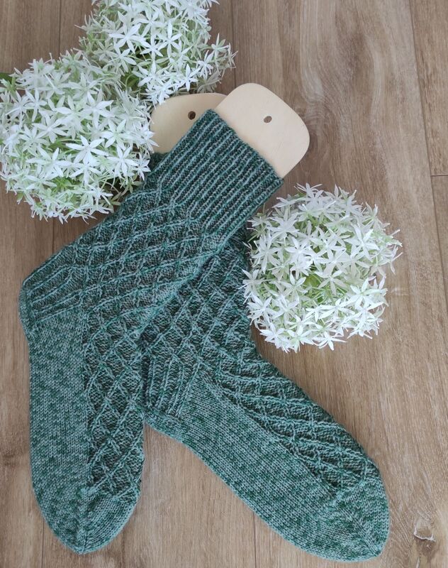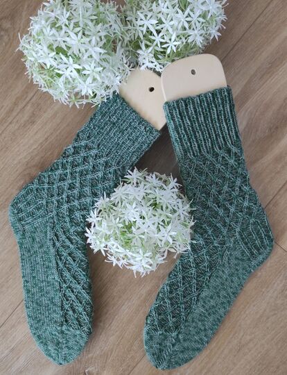 Ein klares geometrisches Muster in sanft melierter moosgrüner Wolle - so kann der Frühling kommen. Das Gittermuster kommt durch verkreuzte Maschen zustande, geübte Strickerinnen bekommen das auch ohne Hilfsnadel hin. Auf meinem YouTube-Kanal gibt es ein kostenloses Videotutorial dazu, der Link ist in der Anleitung enthalten. Das Gittermuster nimmt das Bündchenmuster in eleganter Weise auf, ebenso setzt es sich auf der Fersenwand fort - so bekommen die Socken ein Design ohne störende Übergänge.
