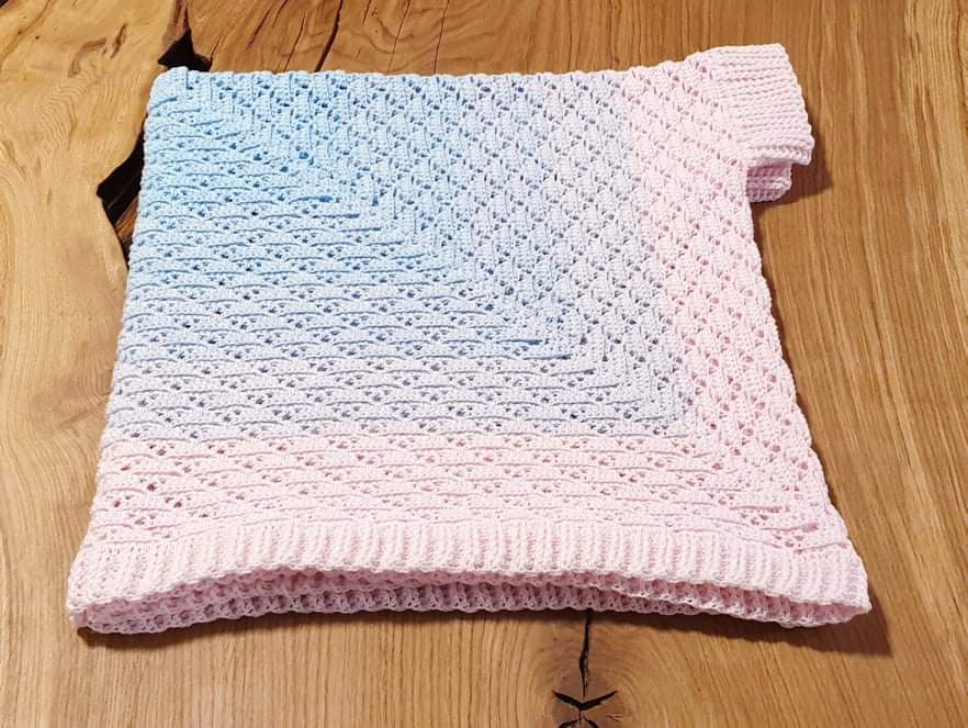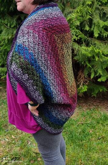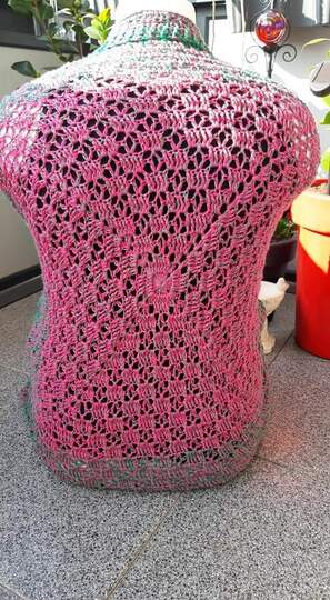Für das Titelmodell wurden fast 1600 Meter eines Farbverlaufgarns (Bobbel) mit 4 Fäden und einer Häkelnadel der Stärke 4 verarbeitet. Die Seitenlänge des Quadrats berägt 95 cm und die Naht ist 25 cm lang. So ist ein Seelenwärmer für die Kleidergröße 40 entstanden, der, wie die Bilder zeigen, recht locker sitzt.