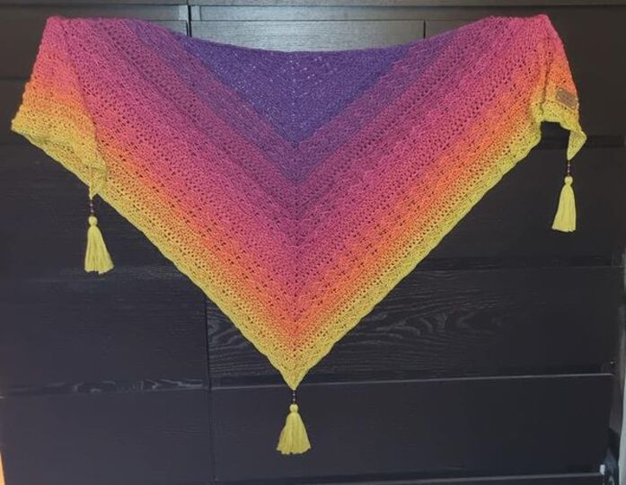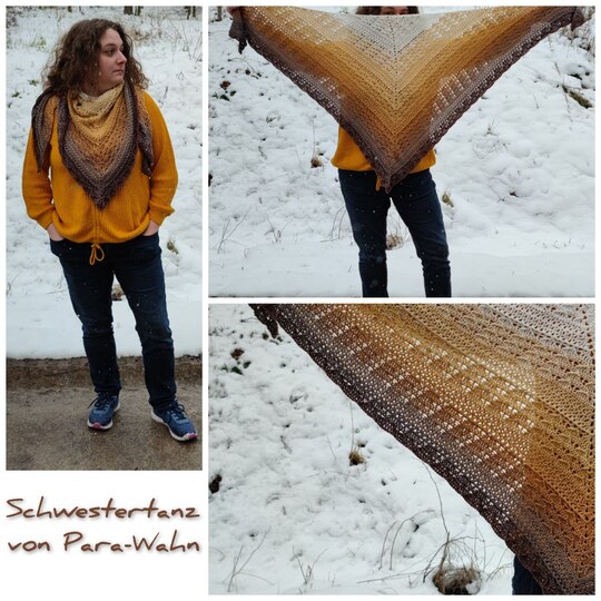 Der Schwestertanz ist ein gehäkeltes, dichtes Dreieckstuch, das durch sein aufwändig wirkendes Muster ein echter Hingucker ist!