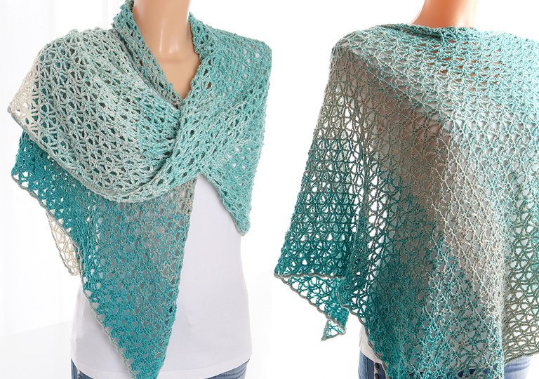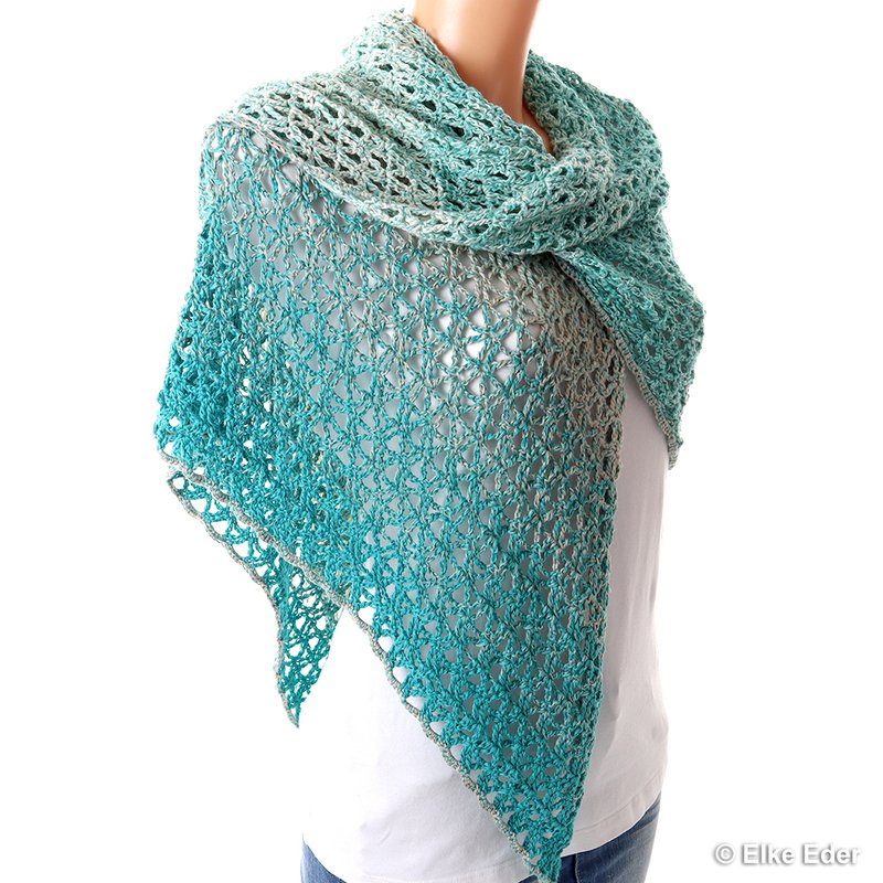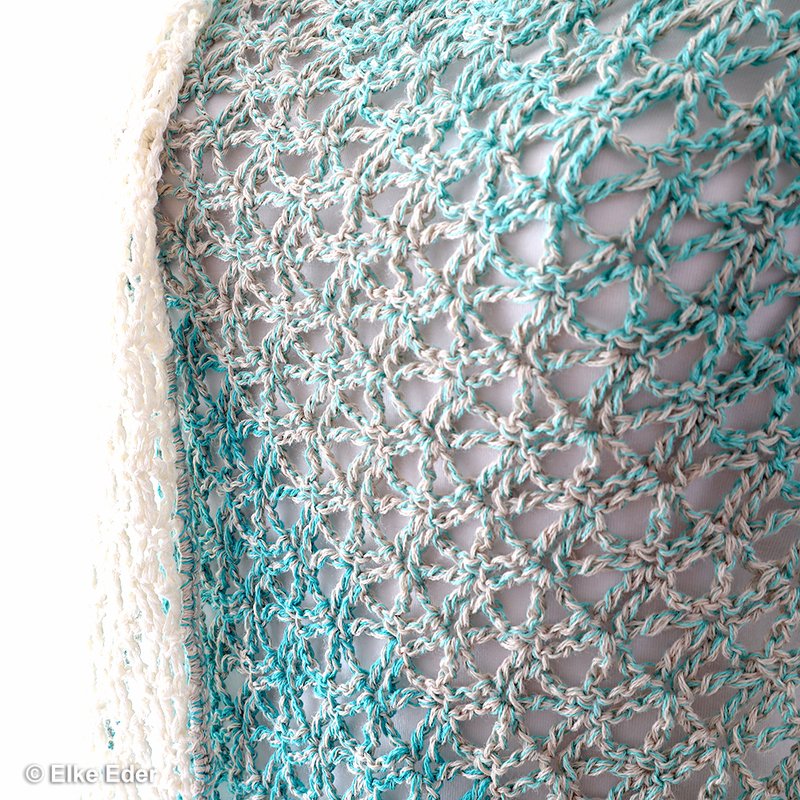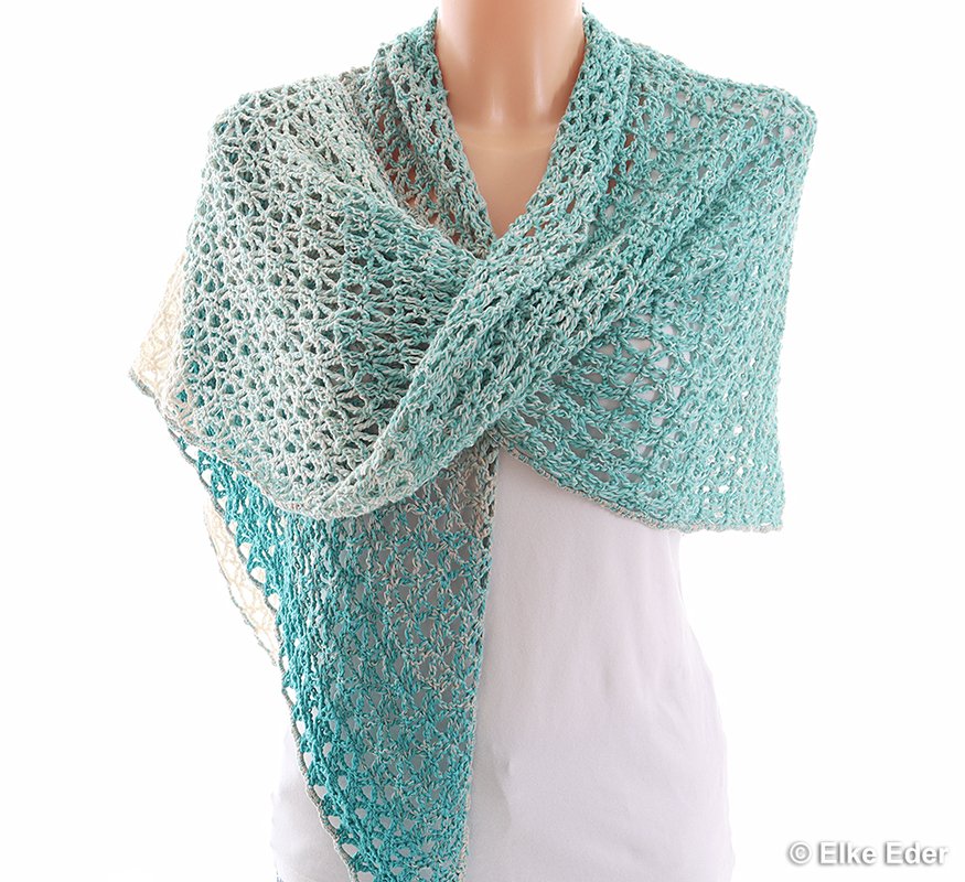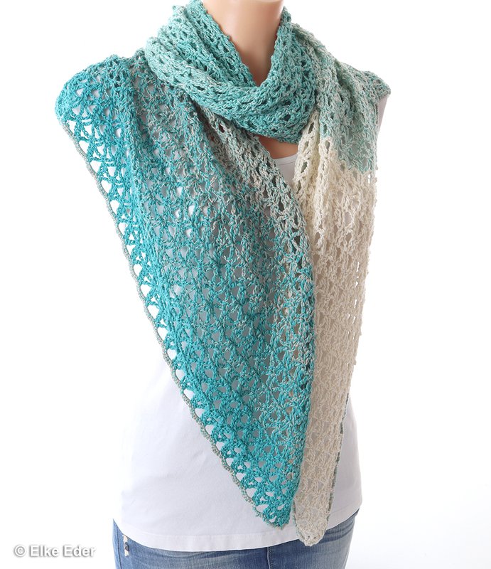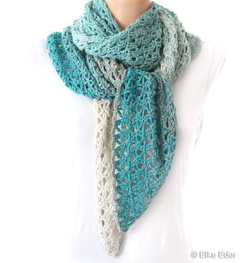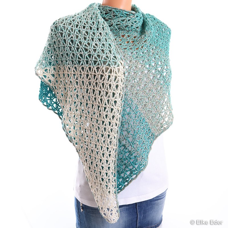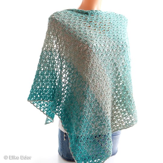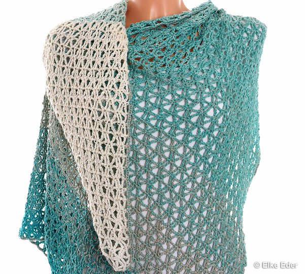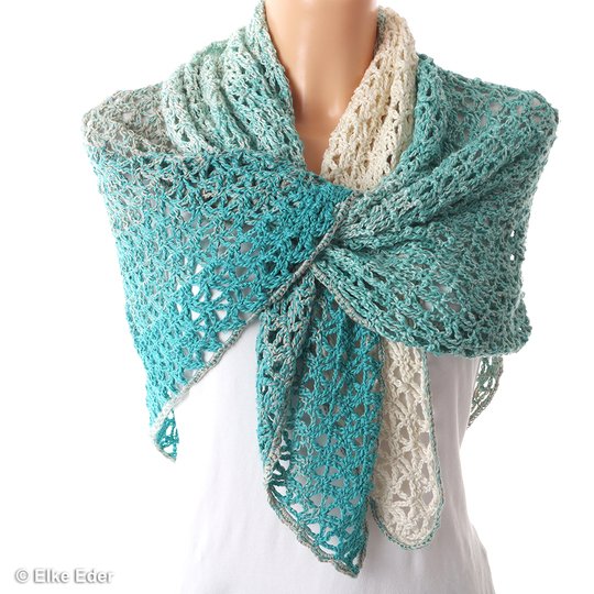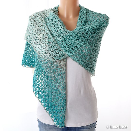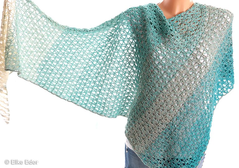 Es wird von der Seite aus gehäkelt. Durch die Länge von 2 Metern und dank des asymmetrischen Schnitts sind viele raffinierte Tragevarianten möglich.