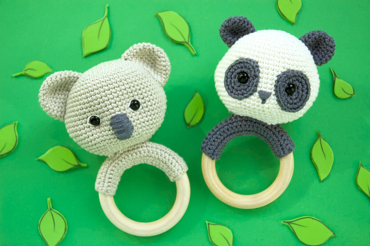 PDF Pattern Set für Koala Bär und Panda Bär Baby Rasseln. Dieses set enthält eine Anleitung für zwei Babyrasseln.