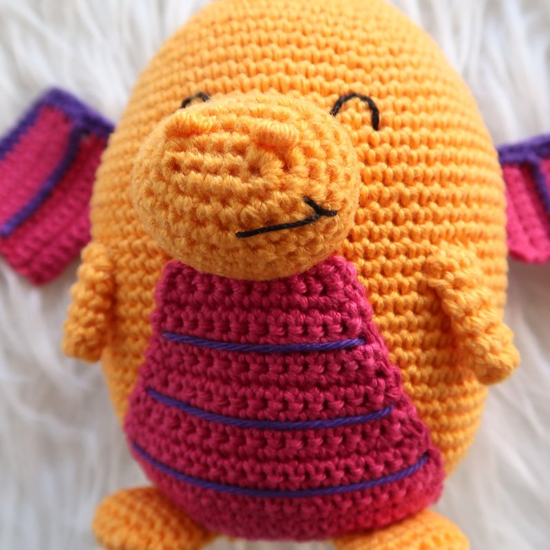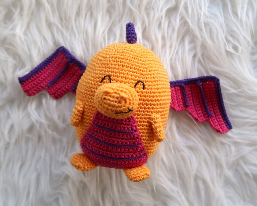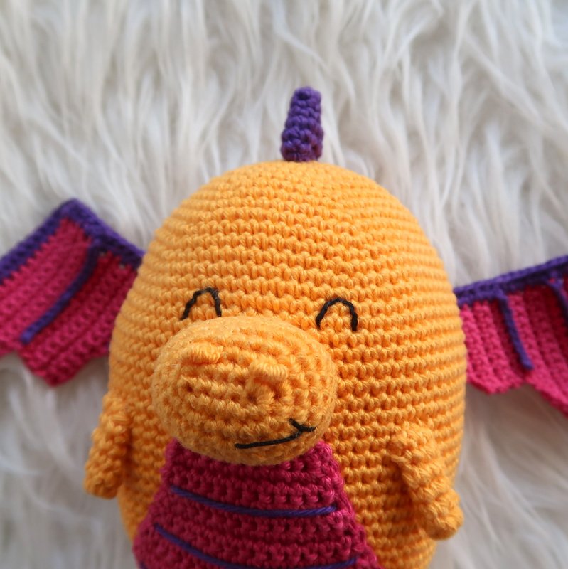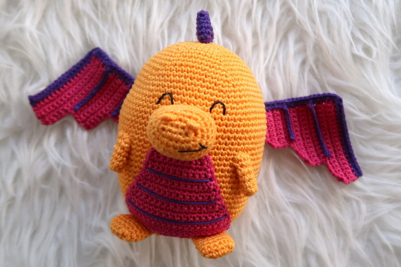 Wenn du mit dem angegebenen Garn häkelst (100% Baumwolle mit 125m LL auf 50g), wird der Drache ca. 16cm hoch.