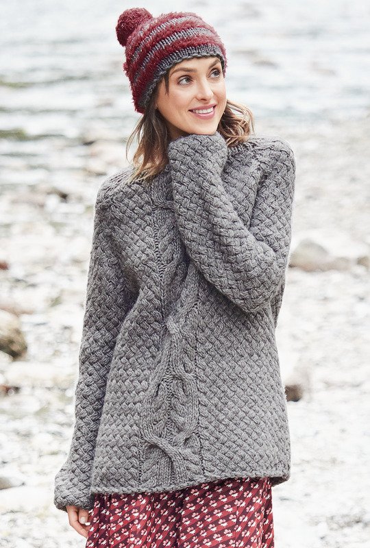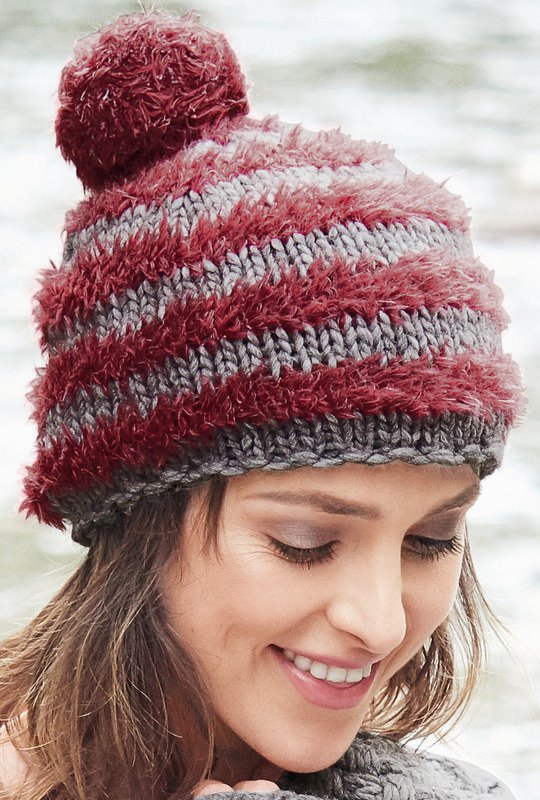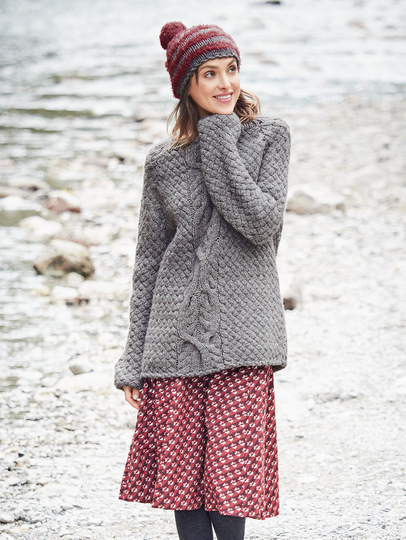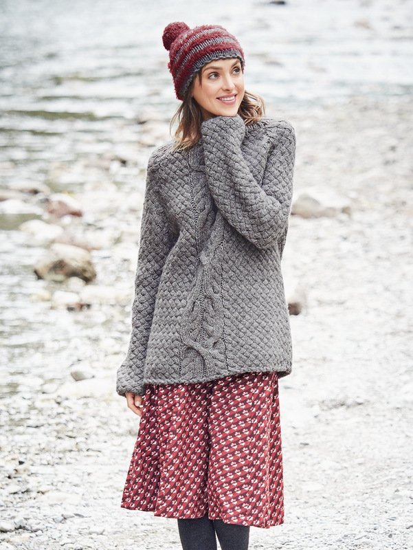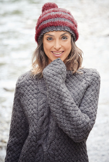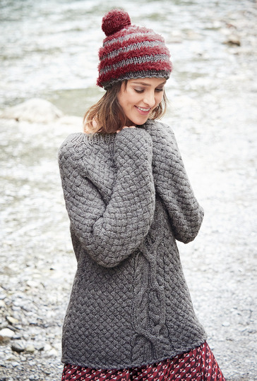 Plastische Flechtstrukturen allover und ein fantasievoller Zopf in der Mitte geben dem grauen Raglanpulli den typischen Handmade-Charakter. Für geübte StrickerInnen, für die auch der Weg zum Ziel die Freude am Ganzen ausmacht, ist dieser Sweater genau das Richtige. So ein Meisterstück ersetzt gut und gerne auch mal die Jacke. Unverzichtbar jedoch bei Minusgraden: die gestreifte Bommelmütze, bei der auch noch ein Fake-Fur-Garn ins Maschenspiel kommt. Die Anleitung für den Pulli gibt es für die Größen 38/40, 42/44 und 46/48; für die Mütze mit 52 – 56 cm Umfang.