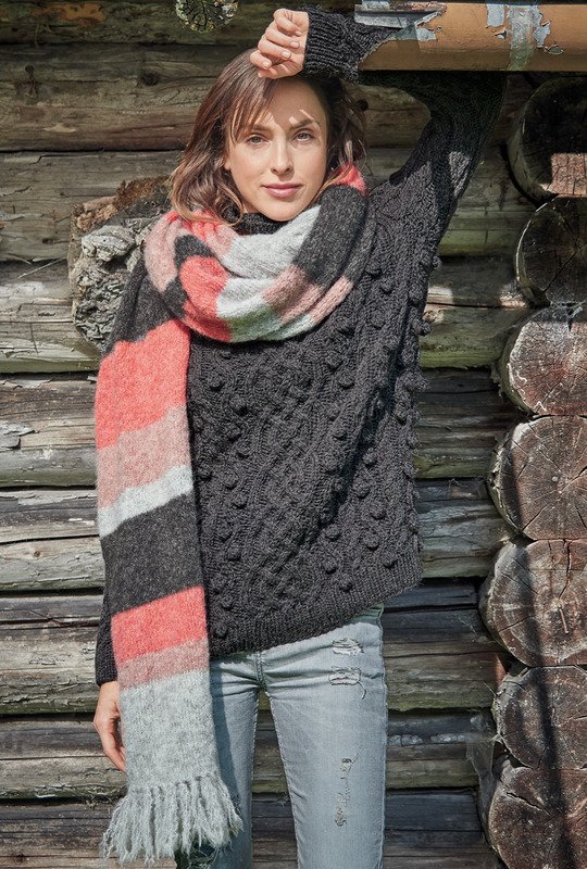 Der dunkelgraue Noppen-Zopf-Pulli in einer für Aranpullis typischen Maschenvielfalt ist für sich allein schon eine Augenweide. Wenn dann aber noch der gestreifte XXL-Schal aus kuschelweichem Flauschgarn in Hell- und Dunkelgrau sowie Rosa und Melone dazukommt, steht einem langen Spaziergang bei Frost und Kalte nichts mehr im Wege. Der hohe Rollkragen wärmt noch zusätzlich; er ist, wie die Bündchen, im 1/1-Rippenmuster gearbeitet. Die Anleitung kannst du für die Größen 38/40, 42/44 und 48/50 herunterladen und für den Schal mit 42 x 250 cm.