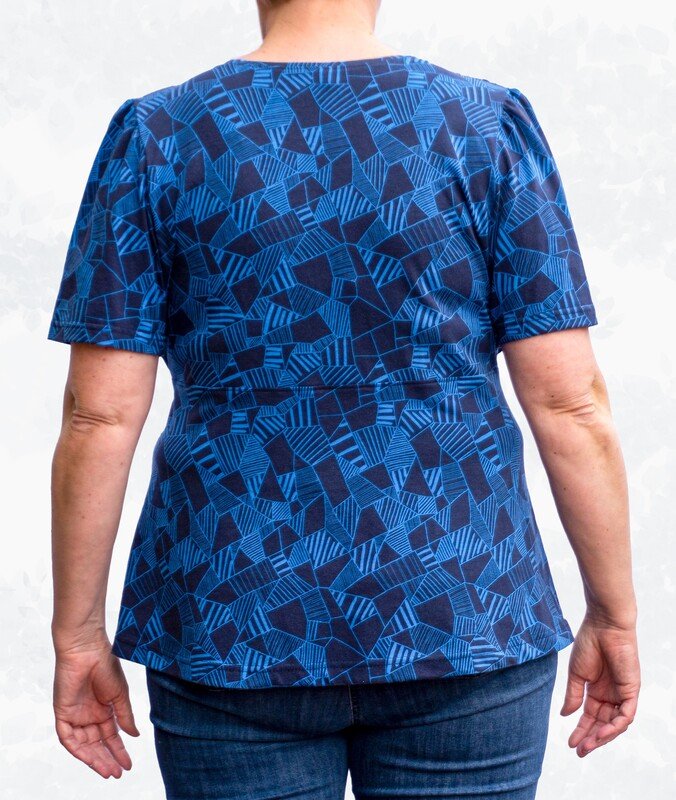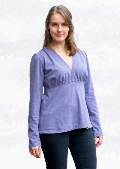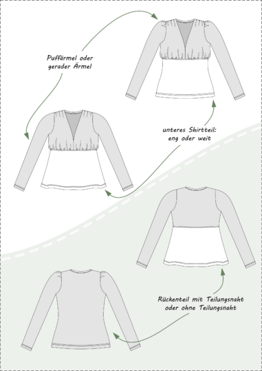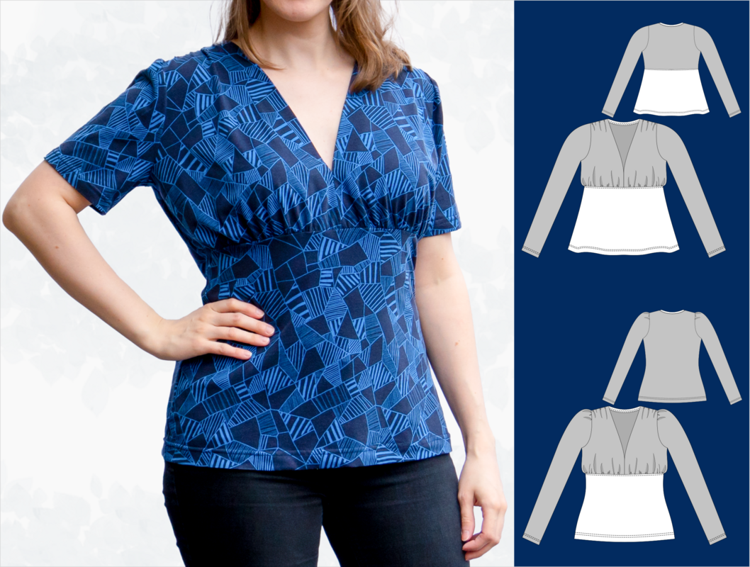 Das Modell „Selina“ ist ein Shirt mit Kräuselungen im Brustbereich. Es hat eine Teilungsnaht unter der Brust im Empire-Stil, wodurch die Kräuselung den Busen besonders gut zur Geltung bringt. Die Ausschnitttiefe des V-Ausschnitts lässt sich individuell anpassen, sodass du entscheiden kannst, wie tief du den Ausschnitt haben möchtest. Das untere Vorder- und Rückenteil kannst du entweder eng für einen figurbetonten Look oder locker für einen umschmeichelnden Schnitt wählen.