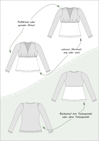 Du hast die Wahl zwischen einem geraden Ärmel oder einem Puffärmel. Beide Ärmelvarianten sind in den Längen kurz, 3/4, 7/8 und lang im Schnittmuster enthalten.