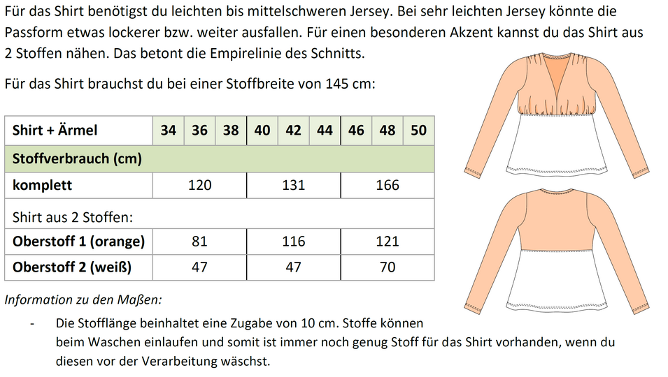 Das Shirt ist für Anfänger mit Näherfahrung geeignet (aufgrund des Umgangs mit Jersey). Es ist vorteilhaft, wenn du mit Jersey umgehen kannst. Falls nicht, wird dir in der Anleitung erklärt, wie du Jersey richtig nähst.