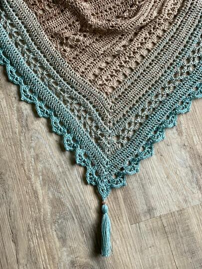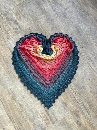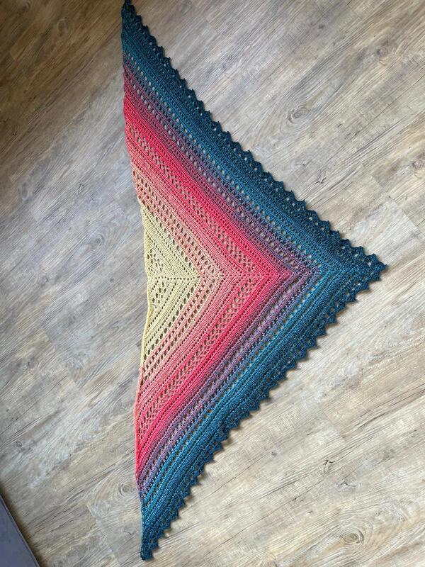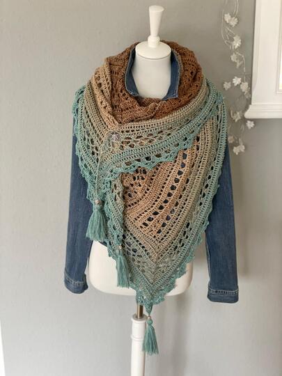 ****In findet ihr 3 Anleitung, für ein symmetrisches Tuch, asymmetrisches Tuch und für eine Kombination aus dem asymmetrischen und symmetrischen Tuch. in jeder Variante ein echter Hingucker. Es besteht aus einem Mustermix und damit sehr gut für den Frühling und Herbst geeignet und ist flott gearbeitet.