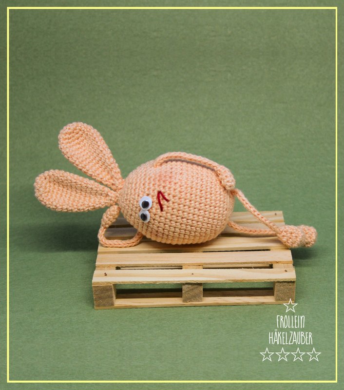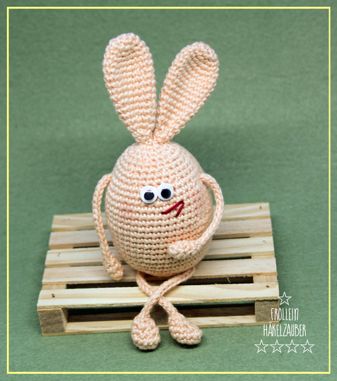 Mit den angegebenen Materialien und einem festen Häkelstil, wird das kleine Häschen sitzend ca. 12 cm groß.