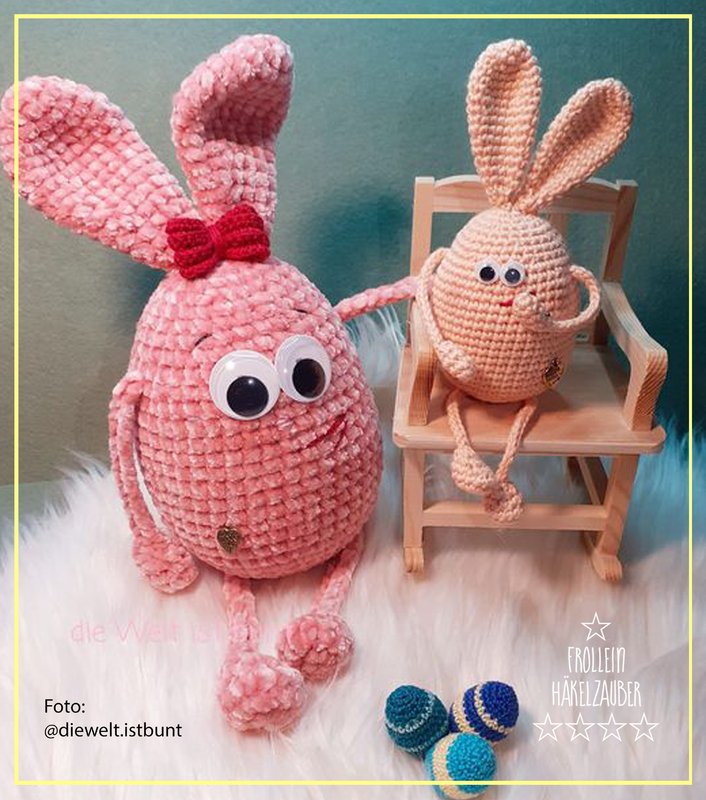 Zum Vergleich ist das Häschen mit Chenille und NS 4.0 gearbeitet sitzend ca. 22 cm groß.