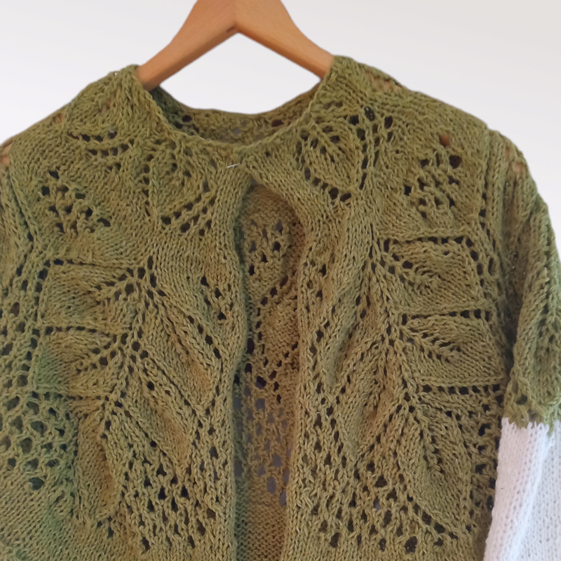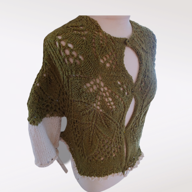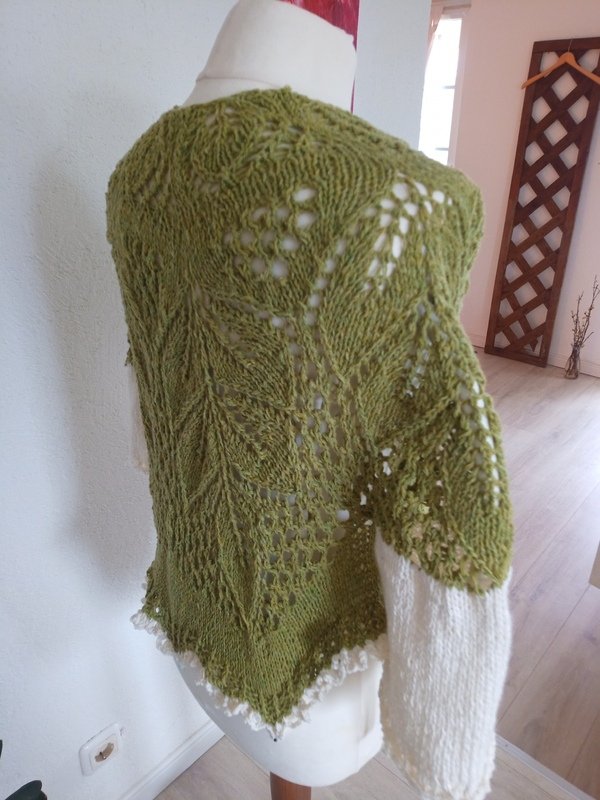 Die Strickjacke hier geht bis zu Taille und hat eine Größe 36/38