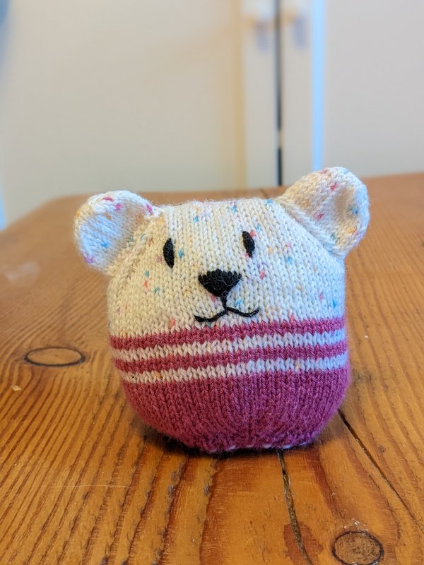 Zunahmen glatt rechts. Der Abschluss basiert auf der Bandspitze, dadurch entsteht die süße Form des