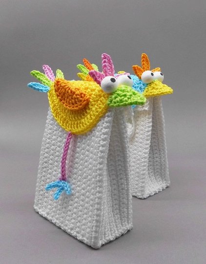 Die PDF Datei umfasst zusätzlich zur schriftlichen Häkelerklärung auch die Häkelschriften für die Tüte und die Details des Vogels und natürlich sehr viele detaillierte und erklärte Schritt für Schritt Fotos, damit Du die lustige Geschenktüte ganz einfach erfolgreich nachmachen kannst.