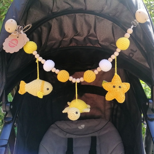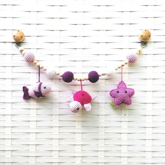 6 gehäkelte Kugeln mit Rasselkugeln und vielen Holzperlen zieren die Kinderwagenkette.