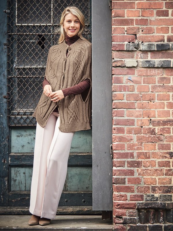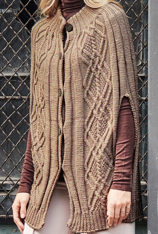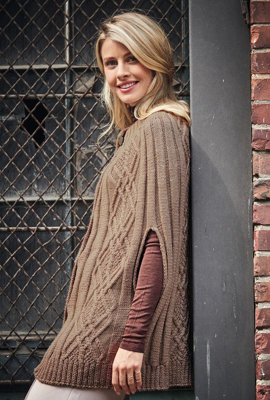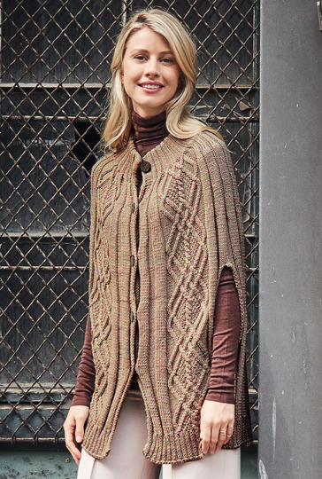 Capes sind ein echtes Statement und werten jeden Look gekonnt auf. Hier mit markanten Zopfstreifen im Aranlook, eingearbeiteten Armschlitzen und perfekt modulierter Schulterpasse. Der Kragen ist doppelt gelegt, die durchgehende Knopfleiste wird gleich mitgestrickt und ist an der vorderen Kante durch einen schmalen Patentrand begrenzt, der Bund im 2/2-Rippenmuster beginnt mit dem doppelten Kreuzanschlag. Sehr geübte StrickerInnen werden sich über dieses Prachtstück freuen, können sie hier doch ihrer Leidenschaft in vollen Zügen frönen. Unsere Anleitung passt für die Größen 36 – 40 und 42 – 46.