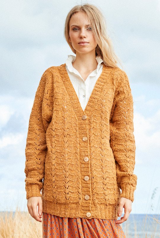 Edles Tweedgarn verleiht der ockergelben Jacke den leicht rustikalen Charakter. Mit dem hohen Anteil an Baumwolle und 25% Seide ist es zudem herrlich sommerlich und bietet einen schönen, angenehmen Fall. Im Gegensatz dazu steht das zauberhafte Wellenmuster, das für die romantische Note sorgt – ein reizvoller Kontrast! Gestrickt wird der Cardigan in Einzelteilen, jedes von unten nach oben. Direkt nach dem Rippenbündchen geht es weiter mit dem Wellenmuster. Das Muster ist nicht schwierig und die übersichtliche Strickschrift sorgt dafür, dass stets der Überblick behalten wird. Lediglich bei den Abnahmen für den V- Ausschnitt und den zunahmen bei den Ärmeln muss darauf geachtet werden, dass sich die Umschläge und zusammengestrickten Maschen in den Musterreihen ausgleichen. Sind alle Teile fertig gestrickt, werden die Nähte geschlossen und alle Verschlussränder und die Halsausschnittmaschen umhäkelt. Aus den Häkelmaschen werden dann die Maschen für die Blende herausgestrickt und diese im Rippenmuster gearbeitet.