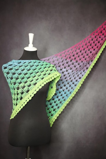 Zum Frühling hin gibt es mal wieder ein Tuch mit etwas weniger Reliefmaschen und dafür etwas mehr Luftmaschen. Das Tuch hat eine asymmetrische Form und ist von der Häkelweise vergleichbar mit dem Salaisuus und dem Gezeiten. Das Muster ist absolut fernsehtauglich und sollte auch für Häkelanfänger zu meistern sein.