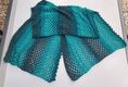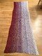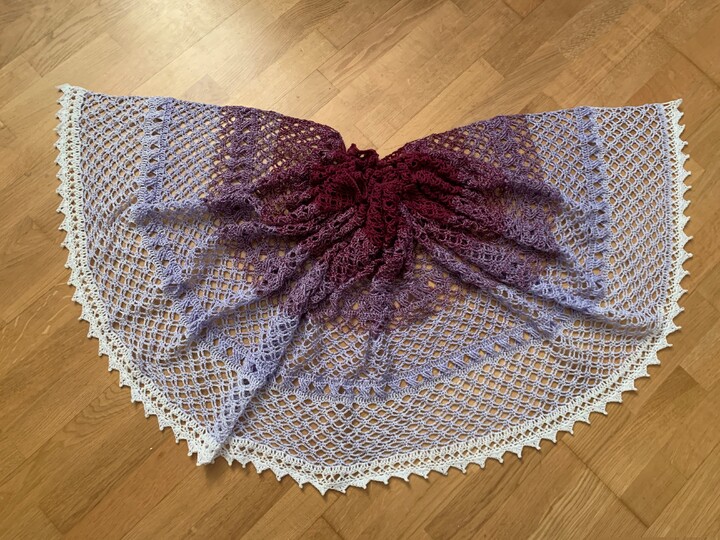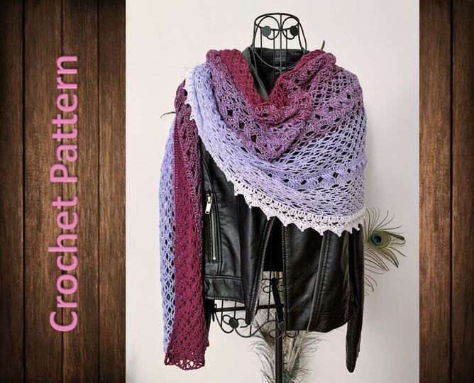Das auf den Fotos gezeigte Tuch hat eine Länge von 200 cm und eine Breite von 60 cm. Änderungen in der Wolle oder der Nadelstärke können natürlich zu etwas anderen Abmessungen führen; die Stola kann auch ohne Probleme länger/breiter oder kleiner gehäkelt werden.