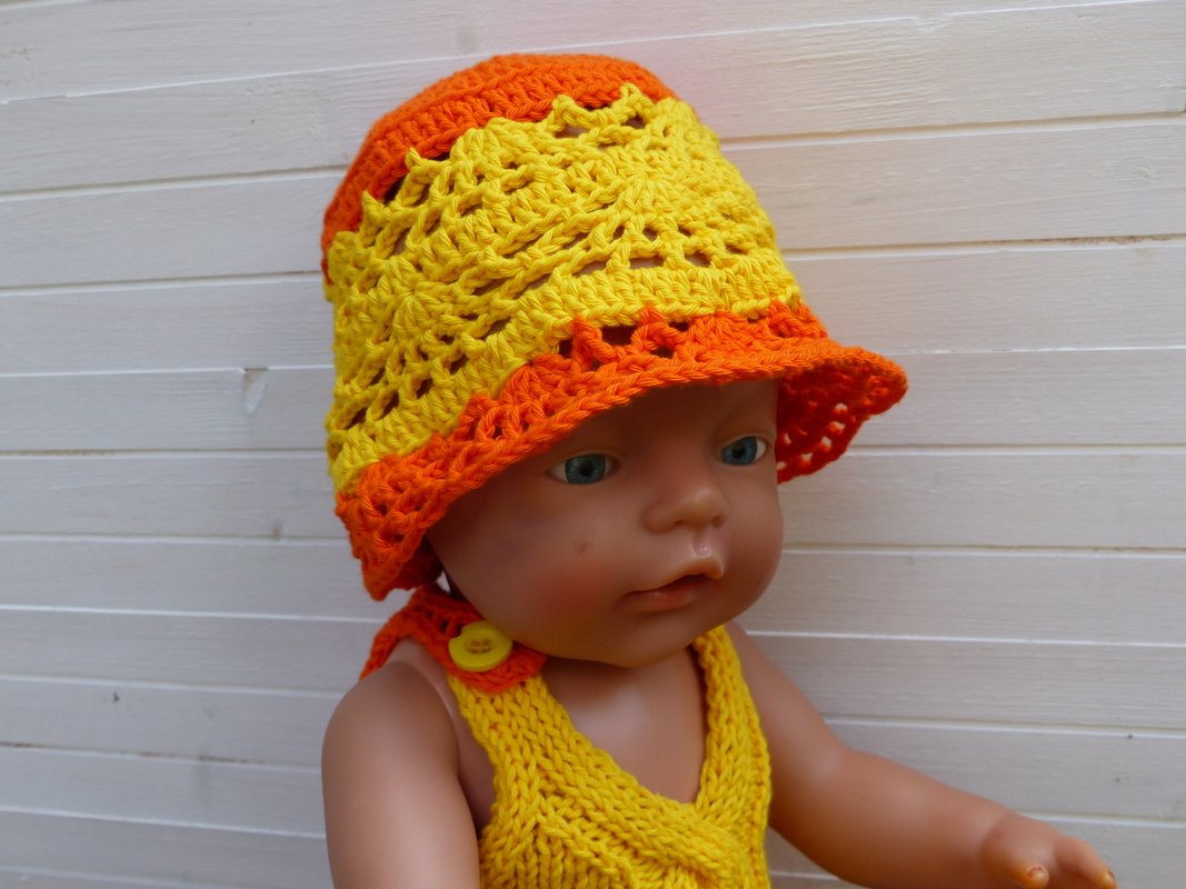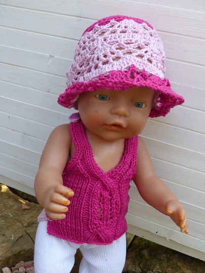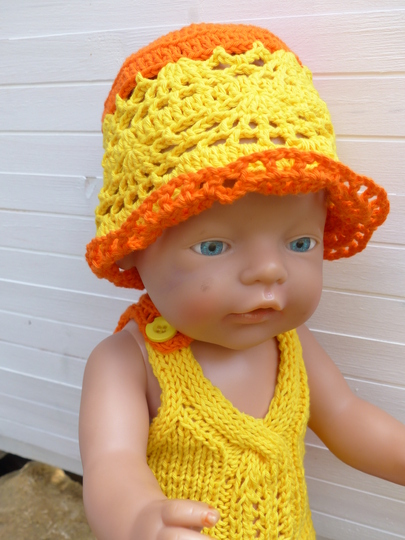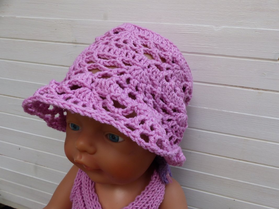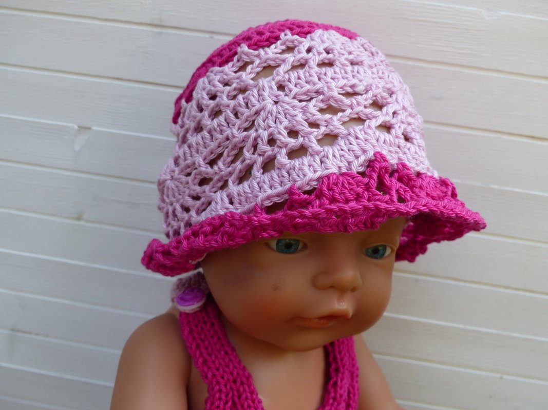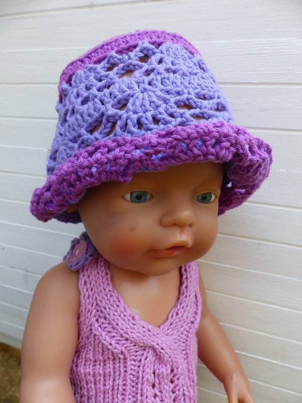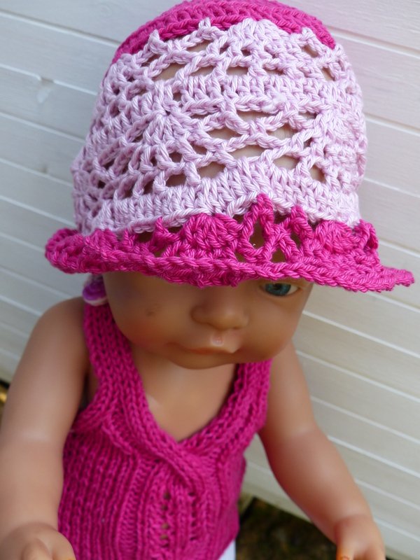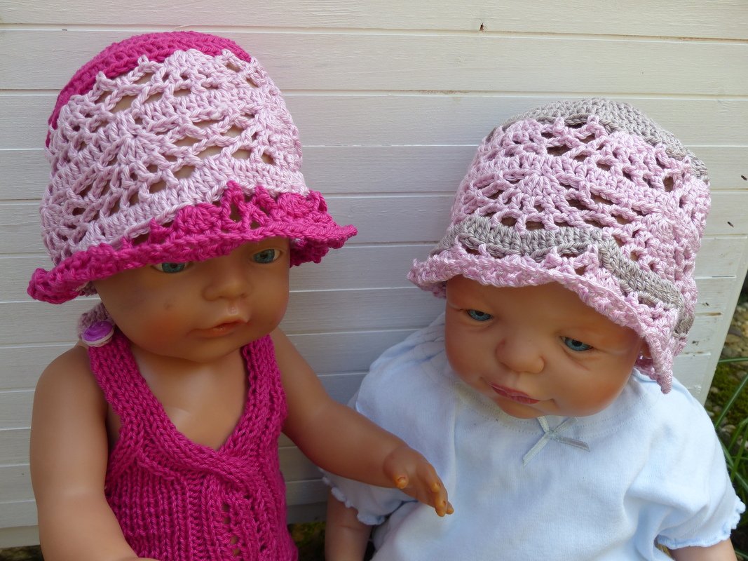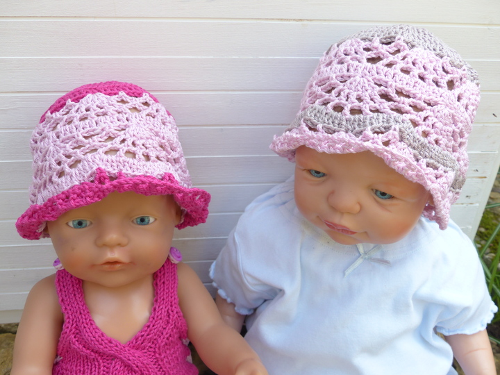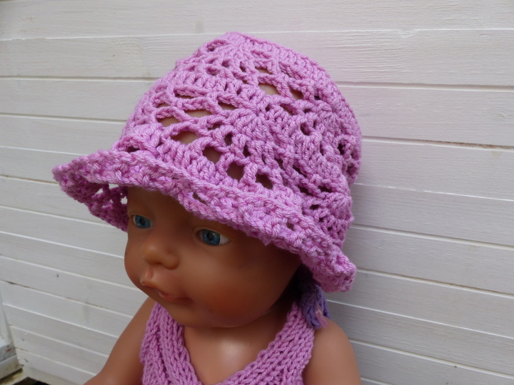 In einem luftigen Lochmuster gehäkelt wird mit diesem Hut die Puppengaderobe ergänzt. Die Anleitung ist für einen Kopfumfang von 33 cm geschrieben. Leicht kann mit der beigefügten Tabelle mit etwas Erfahrung die Sommermütze auch für Babys und Kleinkinder umgerechnet und vergrößert werden.