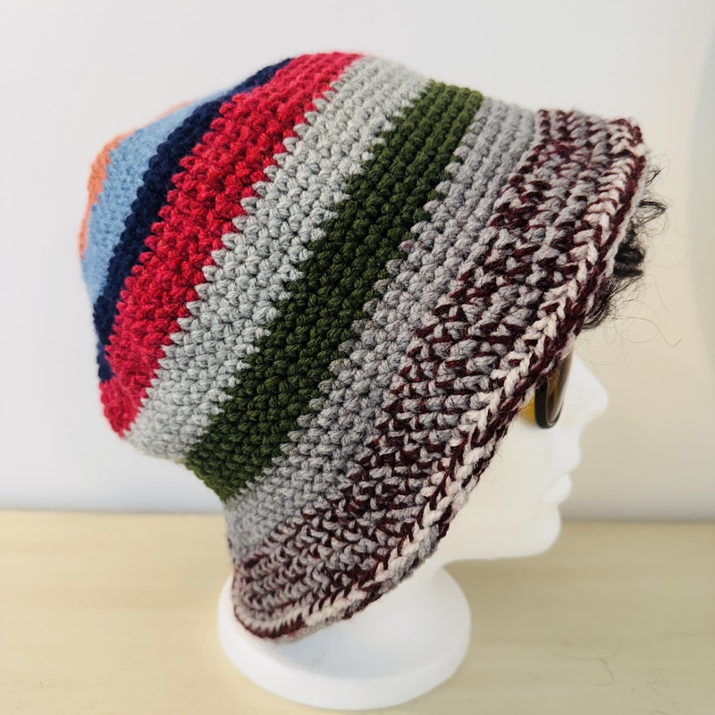 One tip I will share when making bucket hats you should always look for a stiffer yarn as it makes the fit better and the brim will look nicer with a slight bend or straight out.