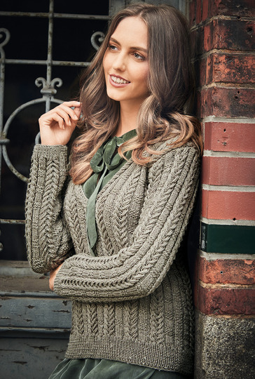 Neue Garnkompositionen machen auch vor Basics nicht halt. Hier handelt es sich um biologische Schurwolle, gemischt mit Hanf (Canabis), der die dezente Tweedoptik dieses Pullis erzeugt. Bei den Mustern fällt besonders das Relief-Zopfmuster ins Auge, ist es doch aus hochgezogenen Maschen gearbeitet und schlängelt sich zweigeteilt auch am V-Ausschnitt entlang. Zwischen diesen markanten Zöpfen ist jeweils ein vertikales schmales Querrippenmuster platziert. Vorder- und Rückenteilbund sowie das Bündchen der Ärmel werden im 1/1-Rippenmuster gearbeitet. Eine Anleitung steht für die Größen 36, 40/42 und 44/46 zur Verfügung.