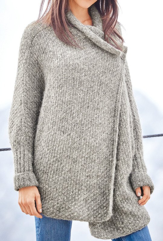 Ein wahrer Wintertraum. Ausschlaggebend sind neue Formen und Details, wie hier bei der großzügigen Jacke mit Fledermausärmeln, bei der eine silberne Kiltnadel als Verschluss dient. Für den Kragen wird einfach weitergestrickt, sodass er lässig übergeschlagen werden kann. Das einfache Reliefmuster aus rechten und linken Maschen und schmale Rippenbündchen an den Ärmeln fallen ins Auge. Besonders schön: der Patentrand an der Verschlusskante. Dabei steht die Bequemlichkeit an erster Stelle. Die Anleitung für die Jacke passt für die Größen 38 – 42 und 44 – 48.