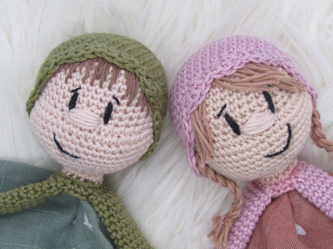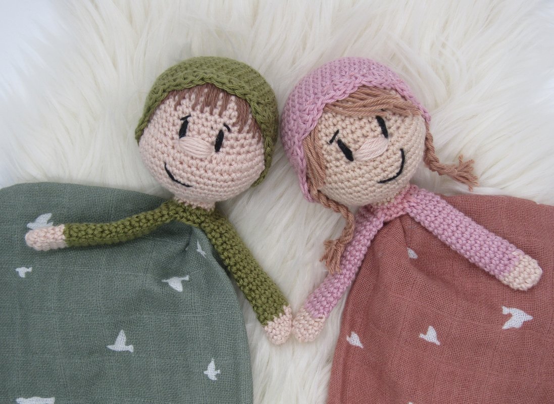 Mit dem angegebenen Garn und der angegeben Nadelstärke, sowie dem Mulltuch werden die Schlummerle ca. 30 cm groß.