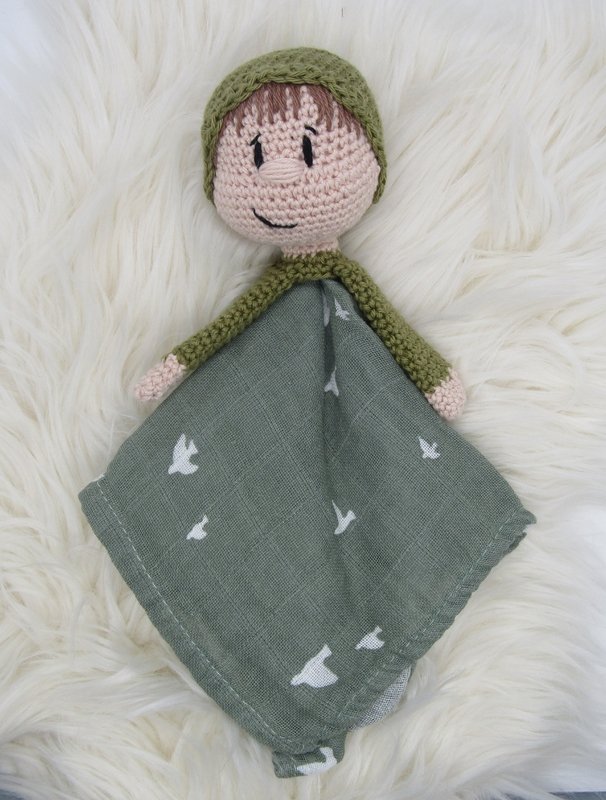 Es werden lediglich der Kopf, die Arme und die Mütze gehäkelt, der Körper besteht aus einem Mulltuch.