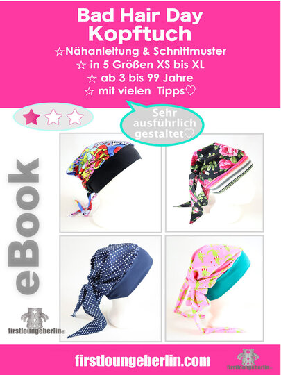 ♥♥ Die Haare sitzen nicht? Kein Problem mit diesem tollen Kopftuch. Schnell einen Knoten in die Haare und das „Bad Hair Day Kopftuch“ drüber und fertig ist das Styling. Das Kopftuch kann auch mit einem Zickzack und Geradstich genäht werden. Die Anleitung ist wie bei allen firstloungeberlin eBooks sehr ausführlich in Bild und Schrift und ganz ehrlich Schritt für Schritt erklärt. Anfänger können nach einer vollständigen Nähprobe sich ihr Lieblingskopftuch gestalten und fix nachnähen.♥♥
