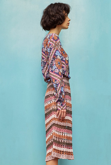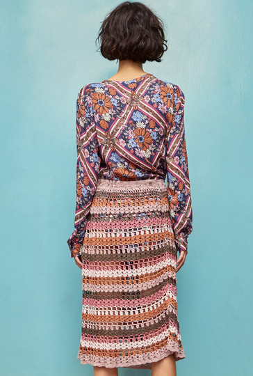 Was wäre der Boholook ohne das passende Zubehör? Häkelröcke gehören unbedingt dazu! Dieser hier ist schmal geschnitten und hat eine Bindekordel zur Regulierung der Taillenweite. Gehäkelt wird der Rock von unten nach oben in Runden. Die leicht ausgestellte Schnittlinie entsteht durch Abnahmen im Verlauf des Häkelmusters. So muss nur noch der übersichtlichen Häkelschrift gefolgt werden, während Streifen für Streifen der neue Boho-Rock entsteht. Ist die angegebene Länge erreicht, wird noch eine Kordel angefertigt und durchgezogen. Wer mag, verziert die Kordelenden noch mit Quasten.