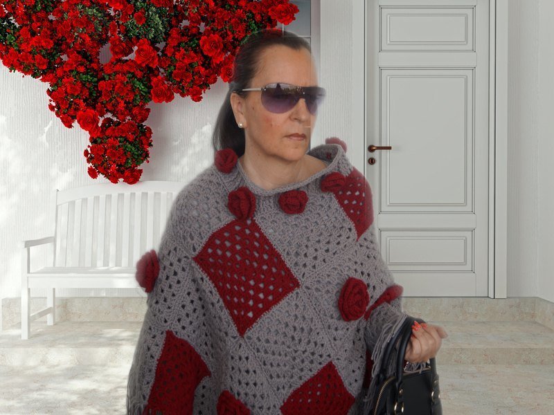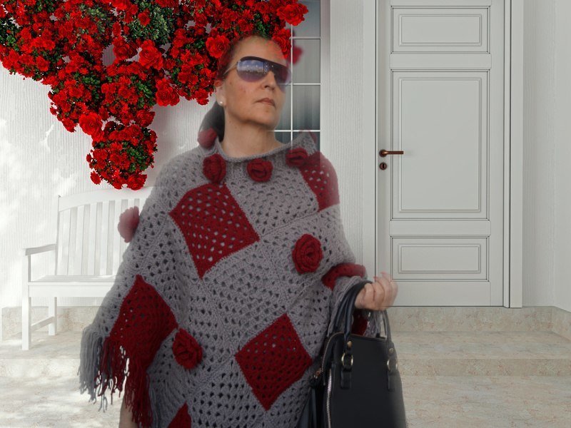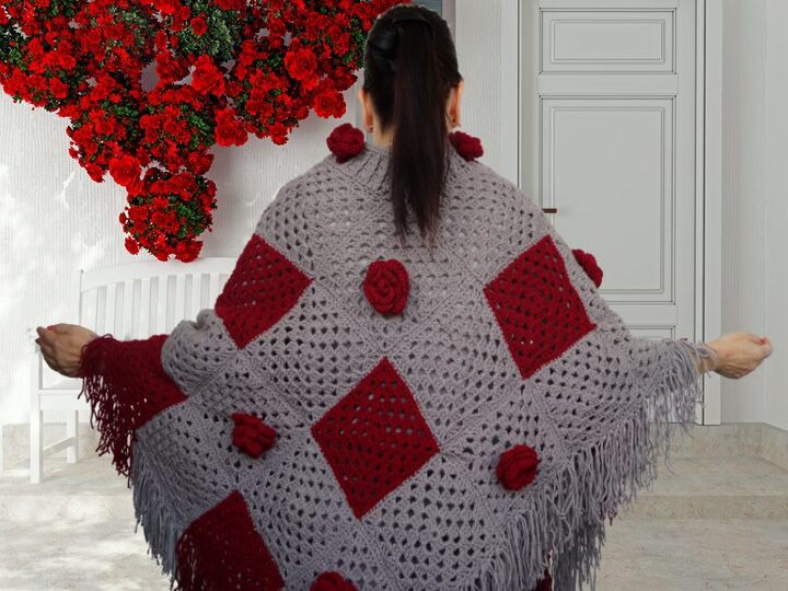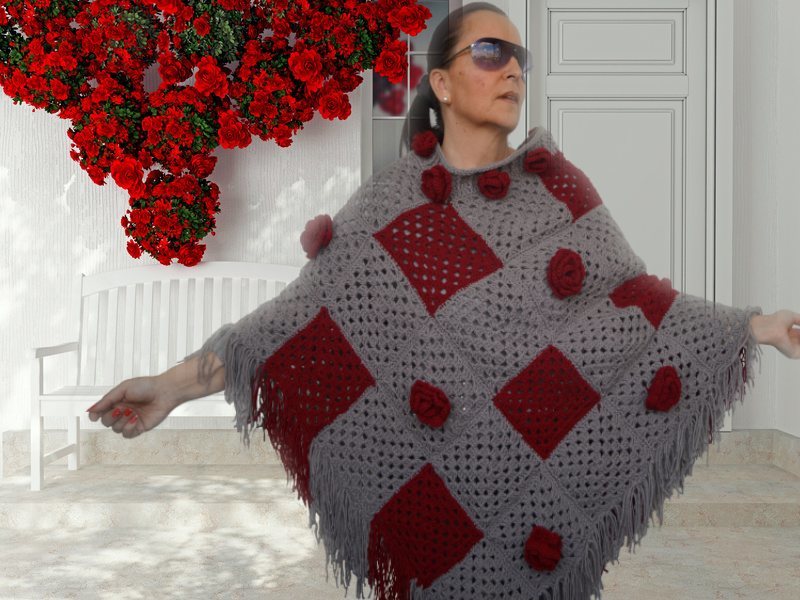 Ein Poncho für den Herbst mit spanischem Flair.Die Rosen in marsala der Farbe des Winters 2017/18 geben dem Poncho das gewisse Etwas. Das Muster der Quadrate kann man relativ schnell auswendig und die Rosen bringen dann die Abwechslung in das Häkelprojekt.