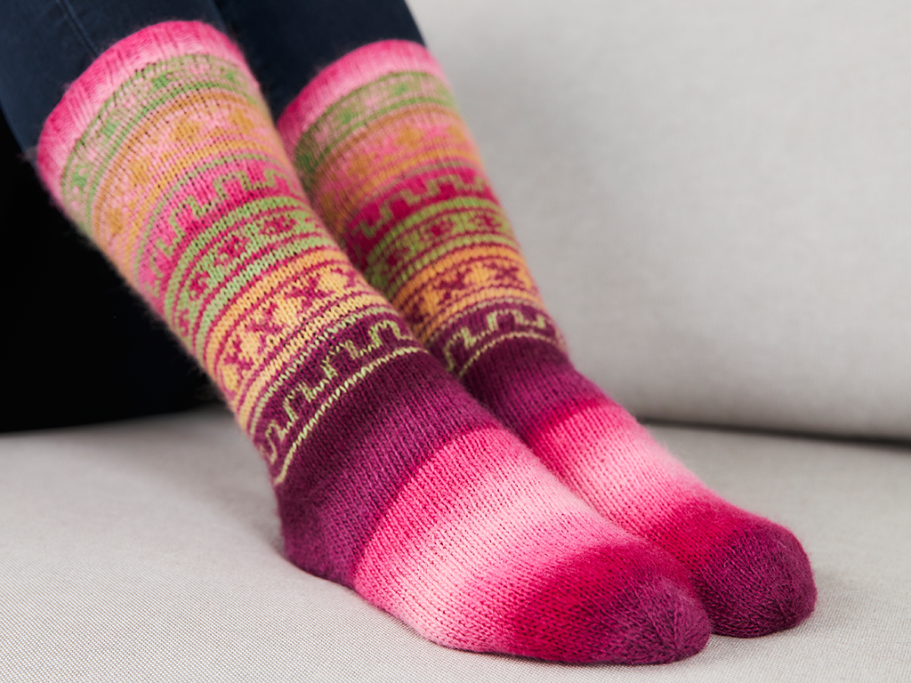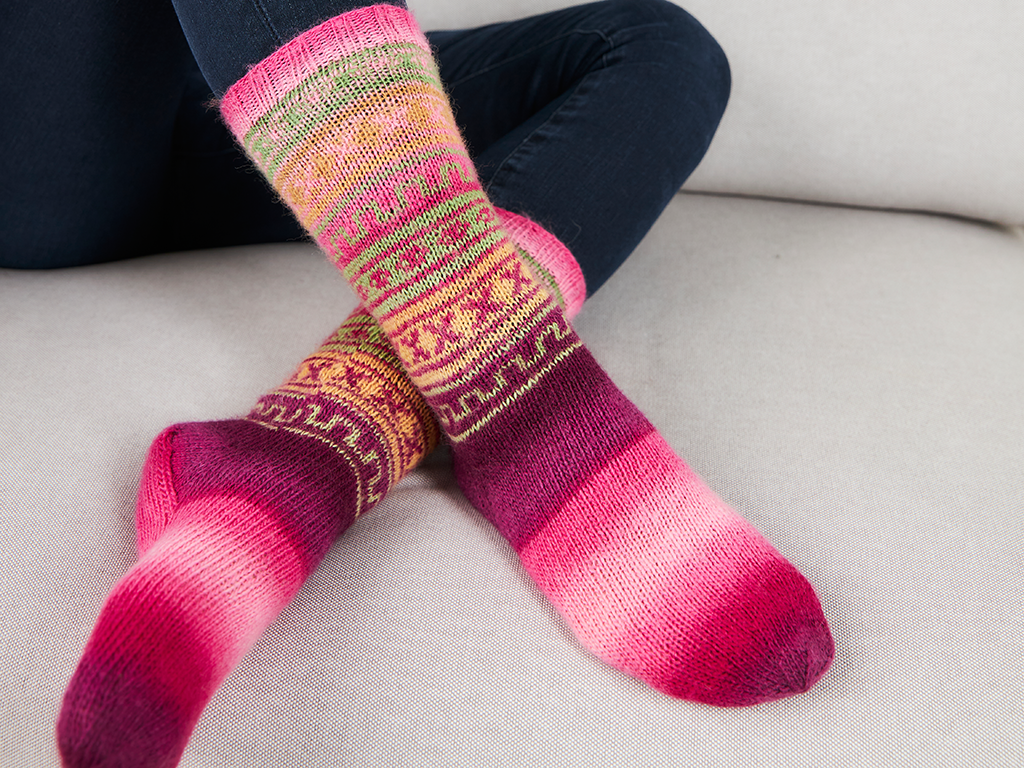 Sind das schöne Socken, die mag man garnicht mehr ausziehen! Mit vielen hübschen Intasienmustern wird es auch nicht langweilig beim stricken. Besonders toll finde ich den Farbverlauf der beiden Garne. Wie der auch die Muster verscheiden wirklen lässt ist immer wieder eine Überraschung. Hier habe ich für das Muster Reste von vorherigen Socken verwendet, aber wenn ihr ein 2. Knäuel dazu nehmt, bleibt auch noch genug Garn für ein farbliche inverses Paar übrig.