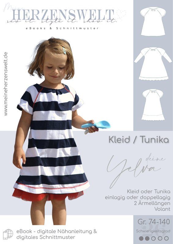 Deine Yelva ist ein schnell genähtes Kleid für kleine und große Mädchen. Das Kleid kann in vier verschiedenen Varianten genäht werden. Du entscheidest, ob du ein einlagiges oder ein doppellagiges Kleid nähen möchtest.