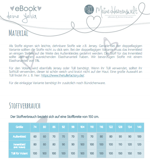 Für das Kleid Yelva eignen sich leichte, dehnbare Stoffe wie z.B. Baumwoll- oder Viskosejersey. Die Stoffe sollten – gerade bei der doppellagigen Variante – nicht zu dick sein. Wenn du den Volant aus Tüll nähen möchtest, benötigst du zusätzlich noch Tüll (vorzugsweise Softtüll). Für die einlagige Variante wird Bündchenware benötigt.