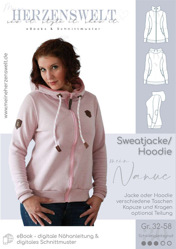 Mit unserem Schnittmuster Nanuc bekommst du einen Schnitt für eine Sweatjacke und für einen Hoodie, es ist also eine sehr umfangreiche Nähanleitung.