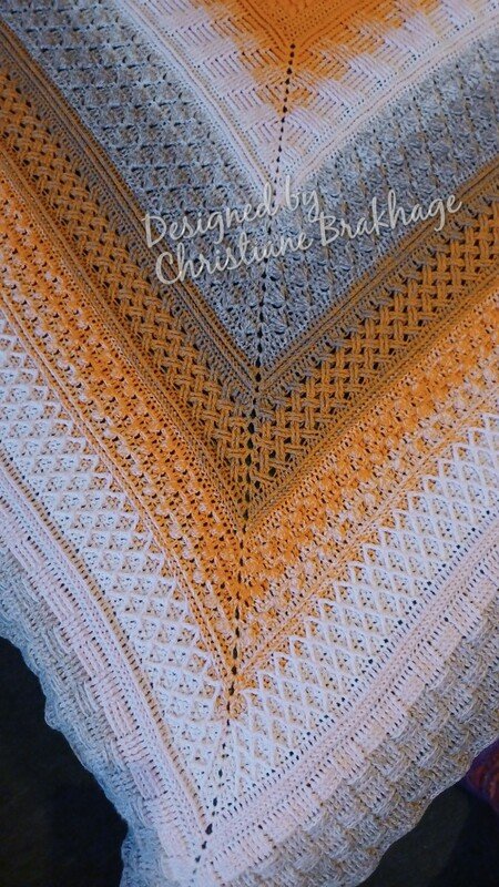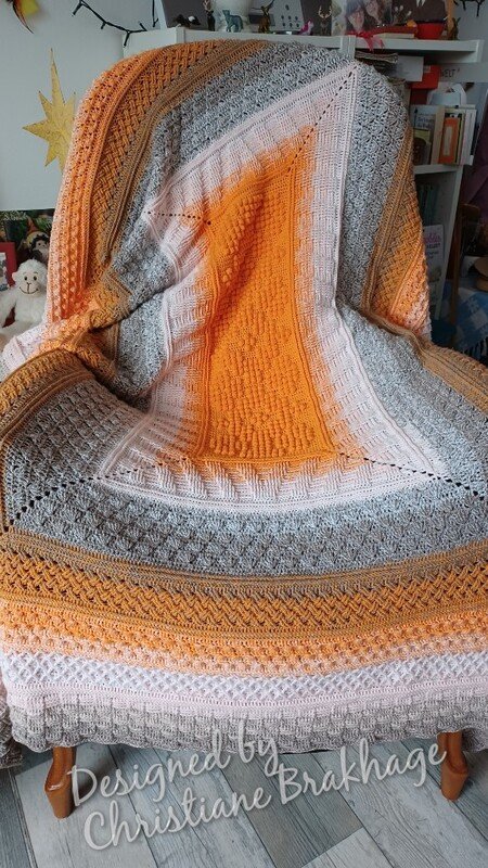 Ich habe 2 Decken gefertigt. Decke 1 aus 4-fädigem Farbverlaufsgarn (50%BW/50%PA) mit Nadelstärke 4,0, sie hat eine Größe von ca. 1,93m x 1,36m.