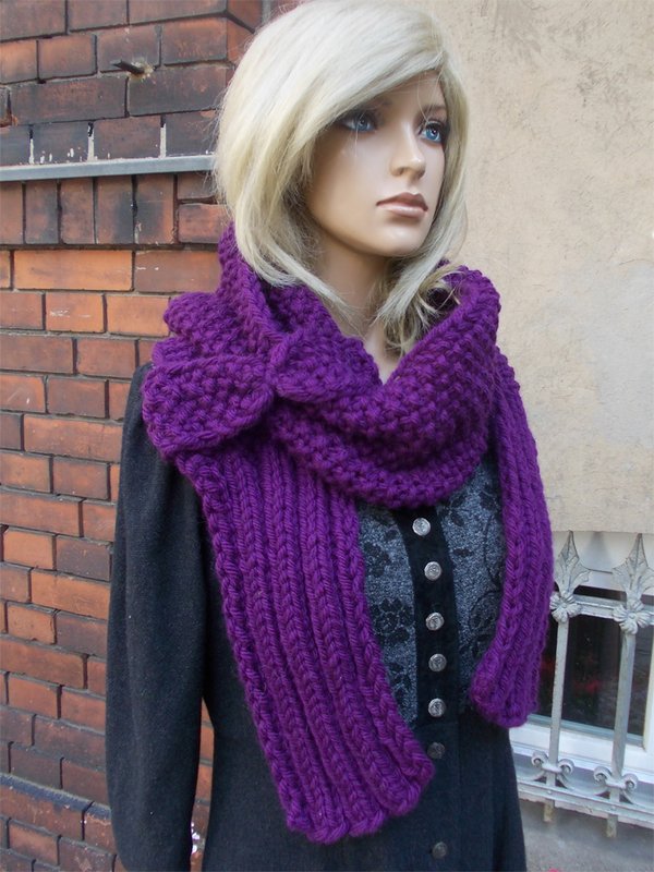 Der Schal kann von der Maschenbreite und der Reihenzahl variiert werden; Näheres in der Anleitung. Da nur rechte und linke Maschen gestrickt werden und die Anleitung sehr einfach verständlich geschrieben ist, habe ich auf Bilder, wie Maschen zu stricken sind, verzichtet. Gleichfalls enthält die Anleitung die Beschreibung für ein Häkelband, ein Strickband sowie für die Strickschleife (siehe Modell in lila).