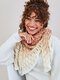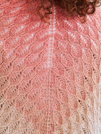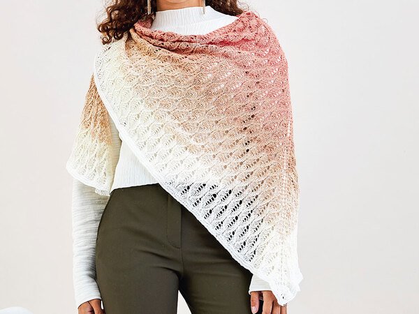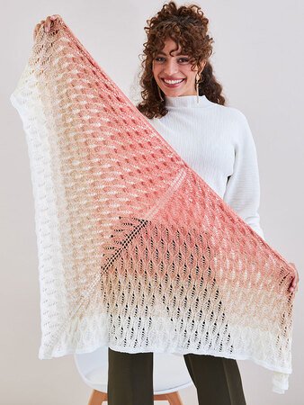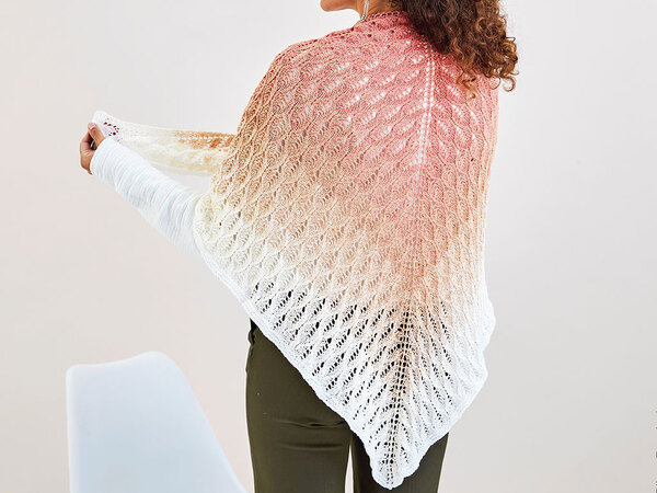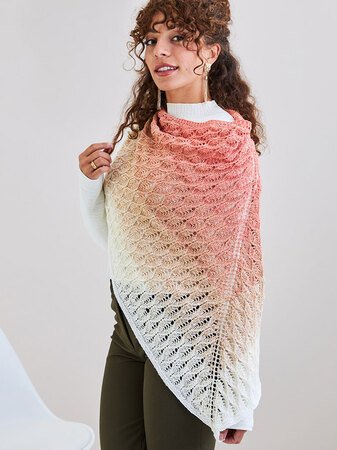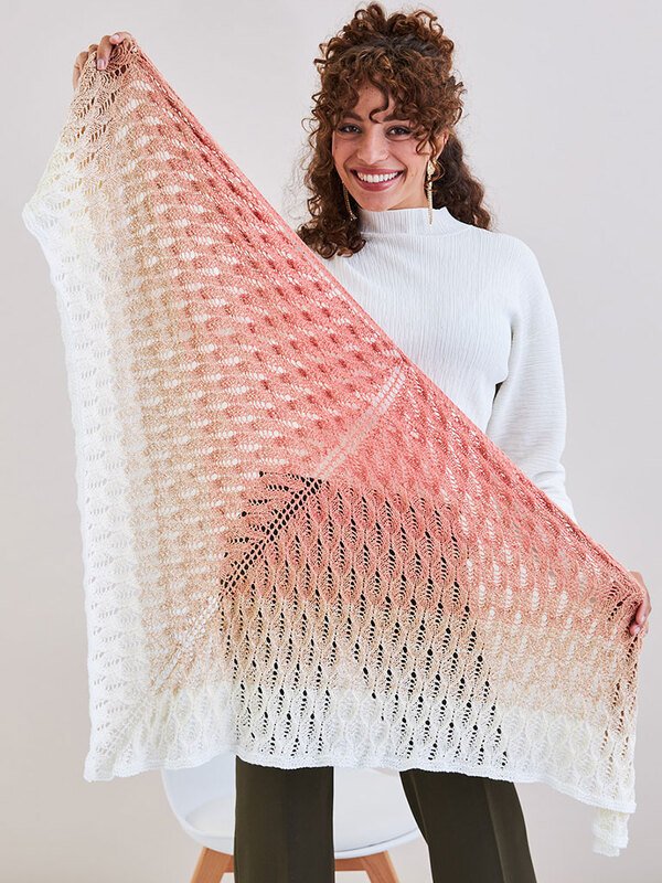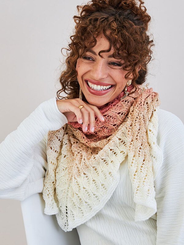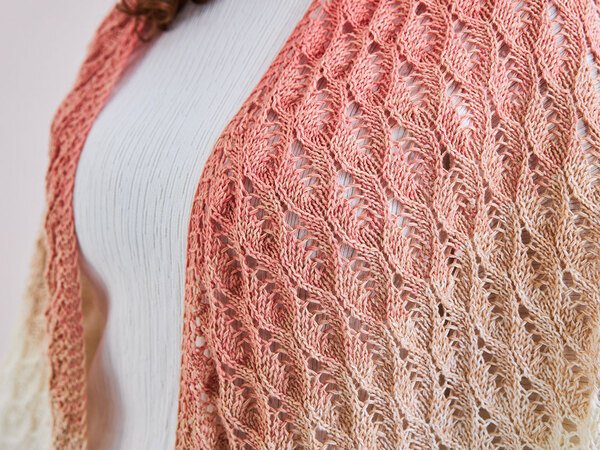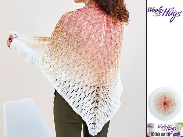 Dieses schöne Tuch ist aus den neuen Farben der Woolly Hugs COTTON gestrickt. Der Farbverlauf der 5 Neuen ist von Weiss sanften bis zu einem pastelligen Farbton. Bei diesem Tuch wurde ein tolles Aprikot gewählt. Zusammen mit einem an Blätter erinnerdem Muster ist das etwas ganz edles entstanden.