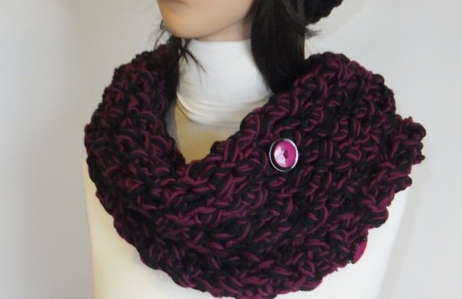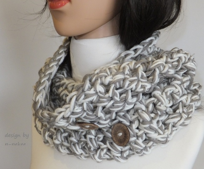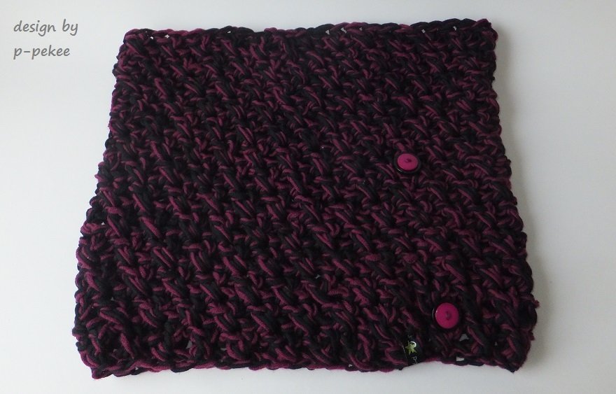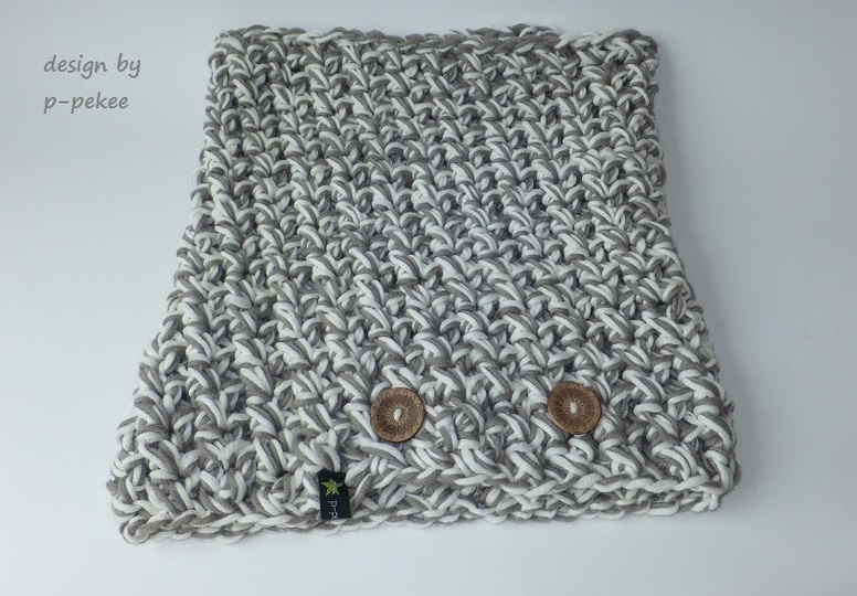 Dazu gibt es auch einen passenden Loop mit XXL-Maschen. Dieser kann mit variablen Knöpfen individuell gestaltet werden. Die Länge des Loops lässt sich - je nach Wunsch und Wollmenge - verändern.