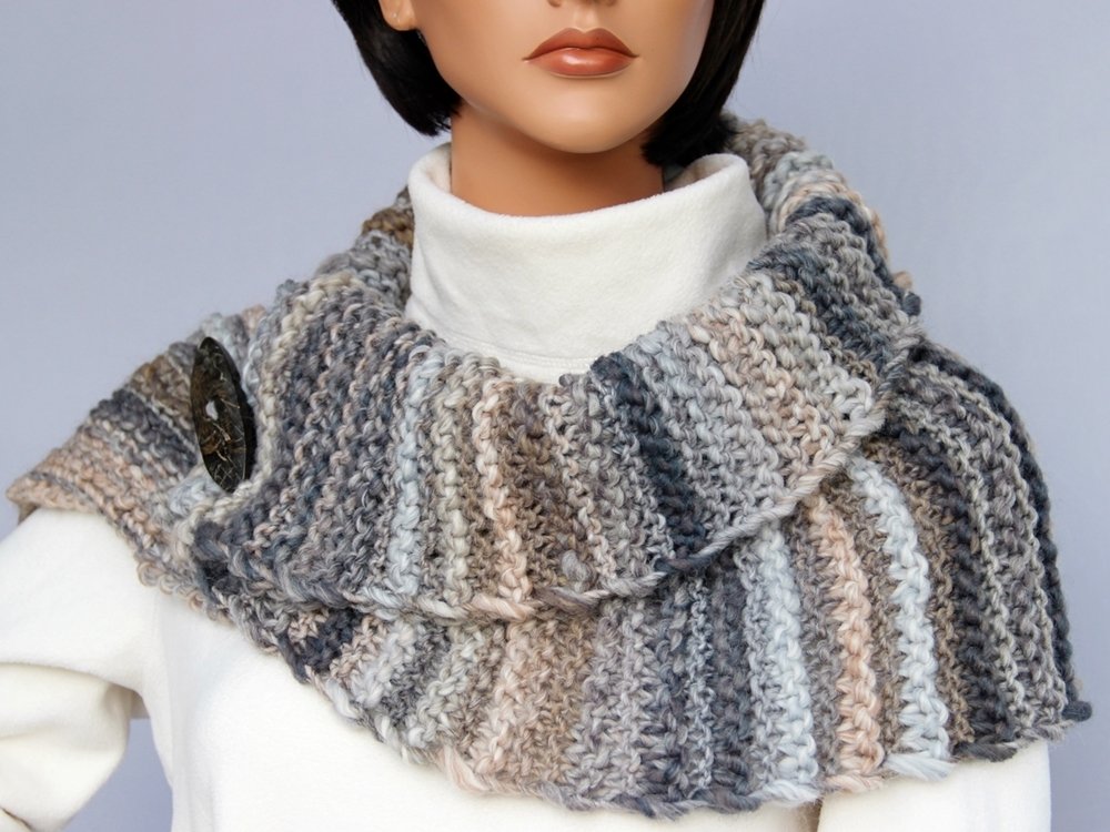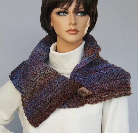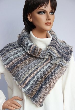 Dieser Schalkragen ist einfach und raffiniert zugleich! Er wird nur aus rechten Maschen gestrickt und bekommt 1 Knopf und 3 Knopflöcher. Er kann unterschiedlich zusammengelegt und geknöpft werden. So hat man ein dekoratives Kleidungsstück mit einem immer wieder anderem Aussehen. Schaut Euch dazu gerne meine Fotos an!