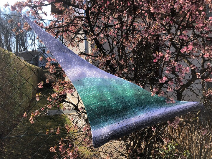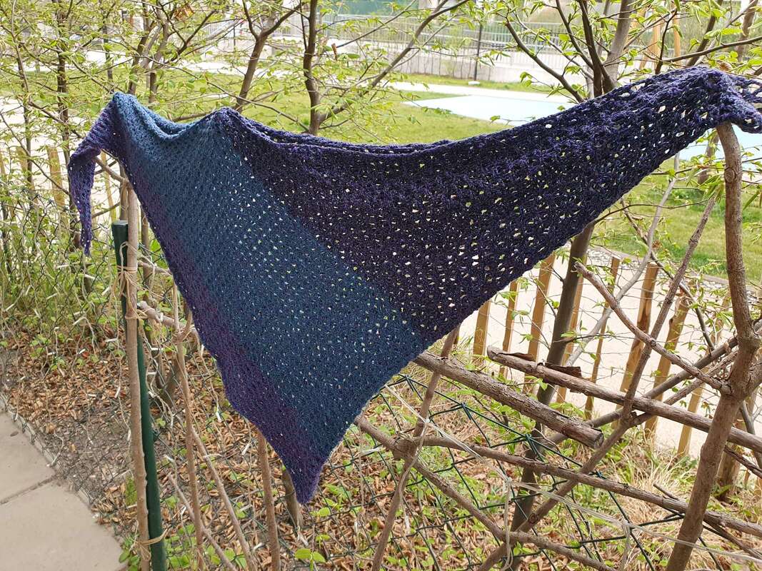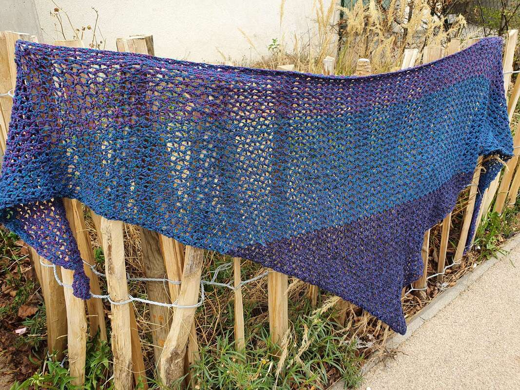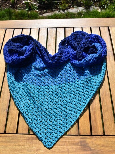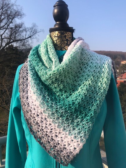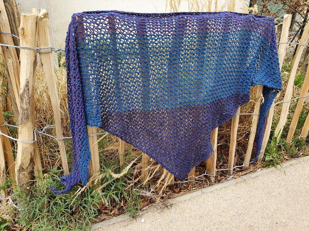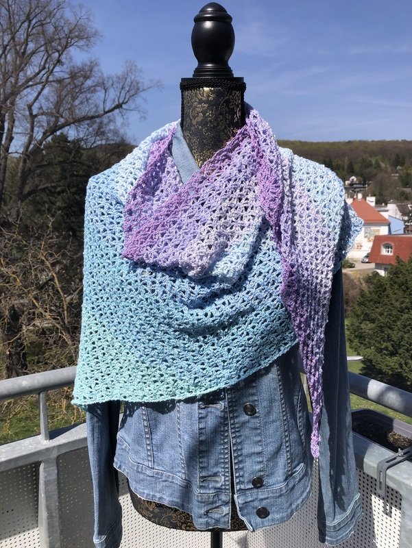 Bei Farbverlaufsgarn empfehle ich je nach Wunschgröße und Häkelstil eine Lauflänge ab 800 m 3-fädig und eine dazu passende Nadelstärke. Wenn du dein Tuch falten und mit schrägem Farbverlauf tragen möchtest (dann ist es auch winddicht und kuschlig), benötigst du bei normaler Häkelweise mindestens 1000 m 3-fädig.