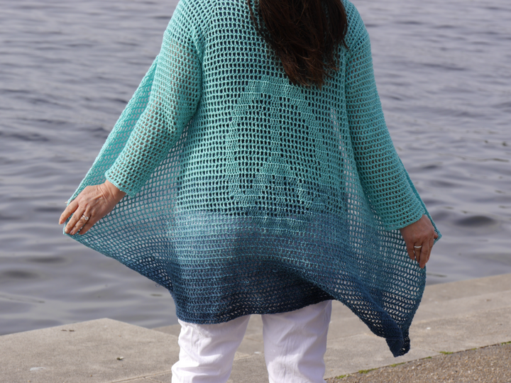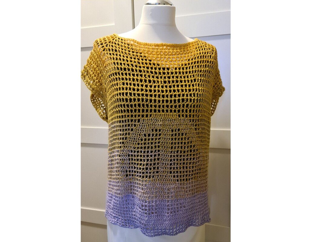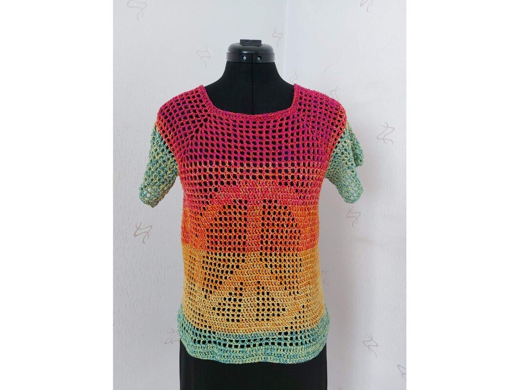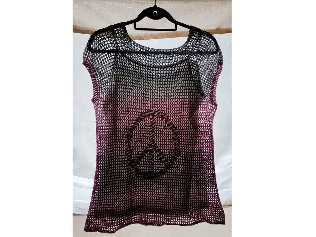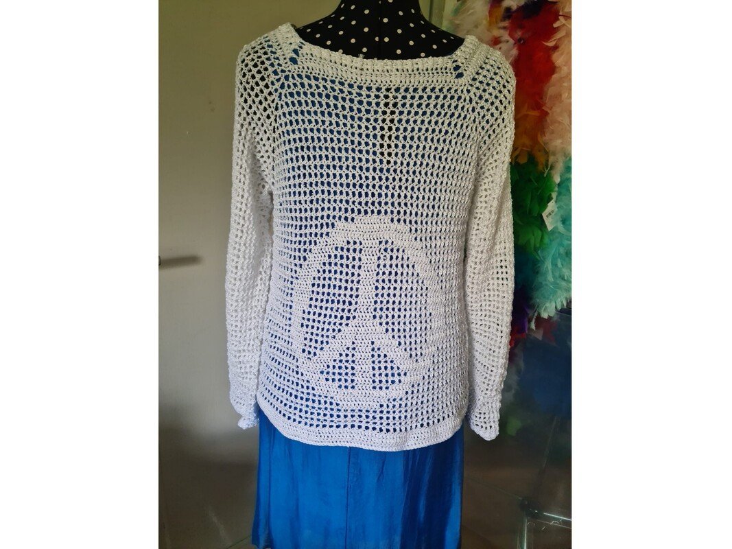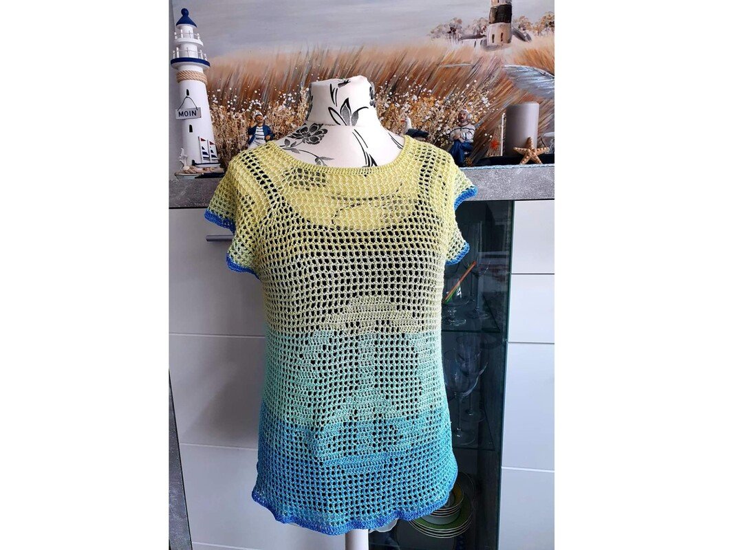 Dieses Shirt und auch die Jacke sind im Filethäkelmuster gearbeitet mit einer extra Häkelschrift für dein spezielles Statement.Du kannst auch jedes andere Motiv wählen und beim T-Shirt auf dem Vorder,-oder Rückenteil platzieren.
