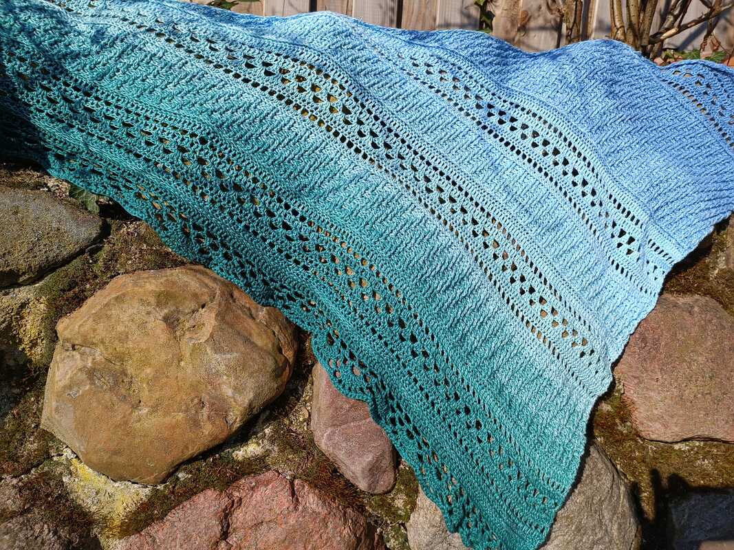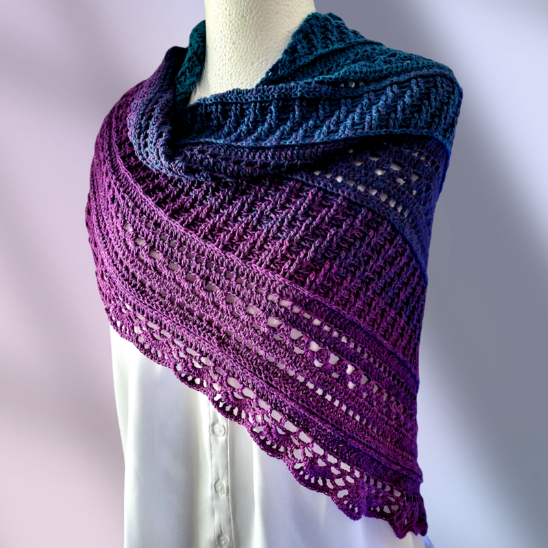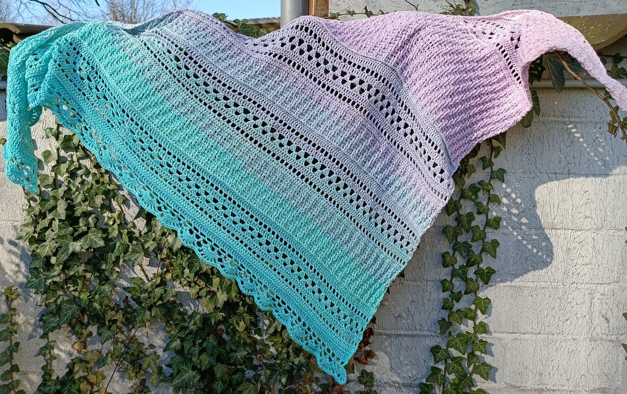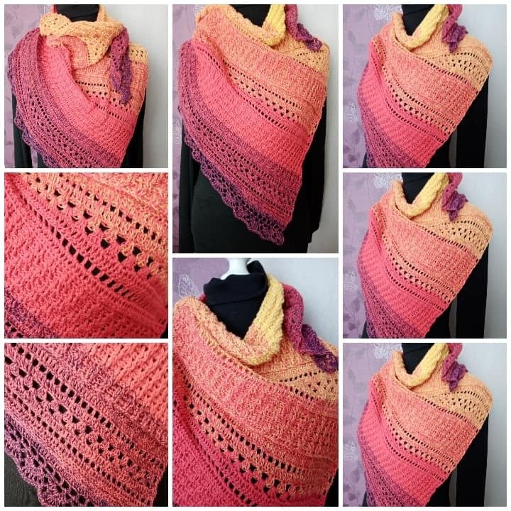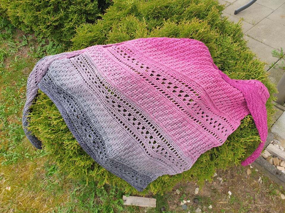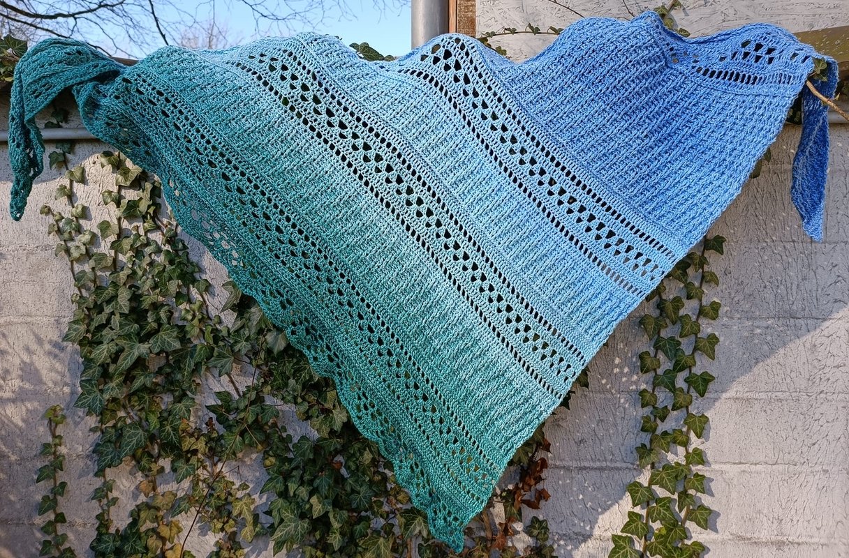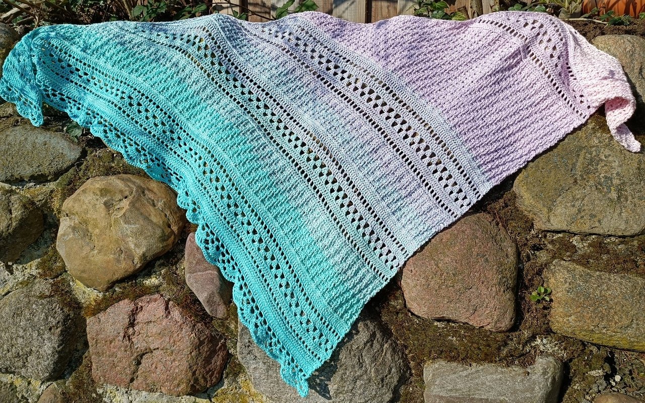 Es wird asymetrisch gehäkelt, also von einer Spitze aus und die Zunahmen finden nur auf einer Seite statt.