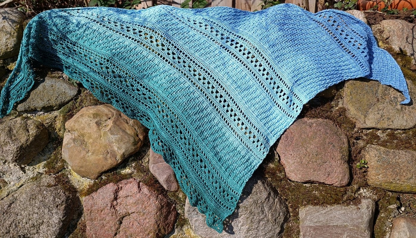 Komplett gearbeitet wirkt das Tuch fast symetrisch.