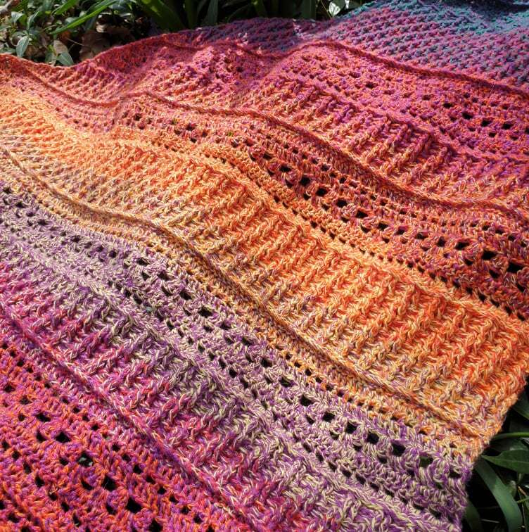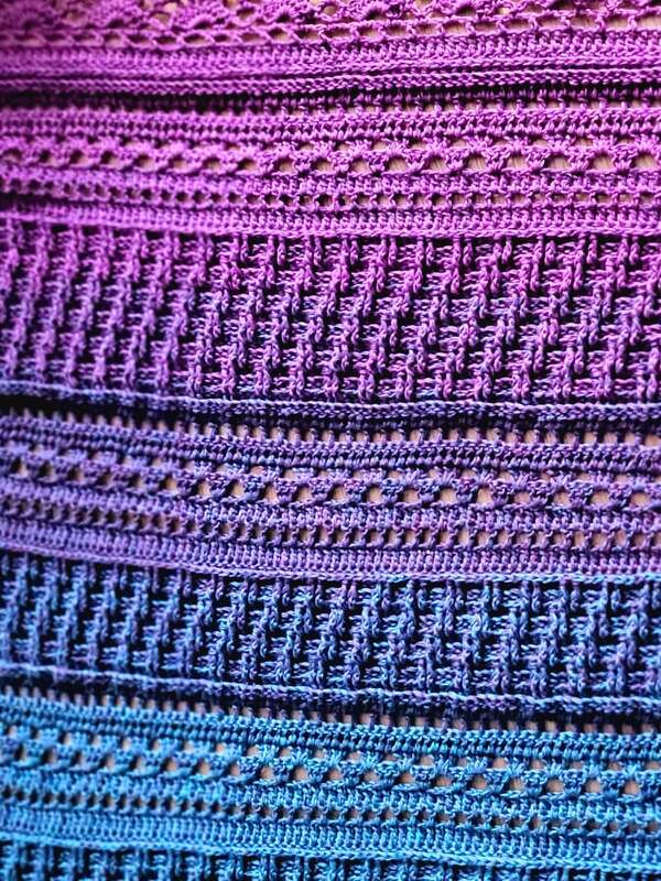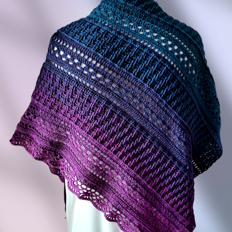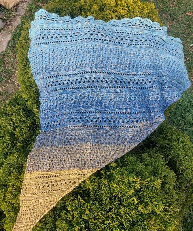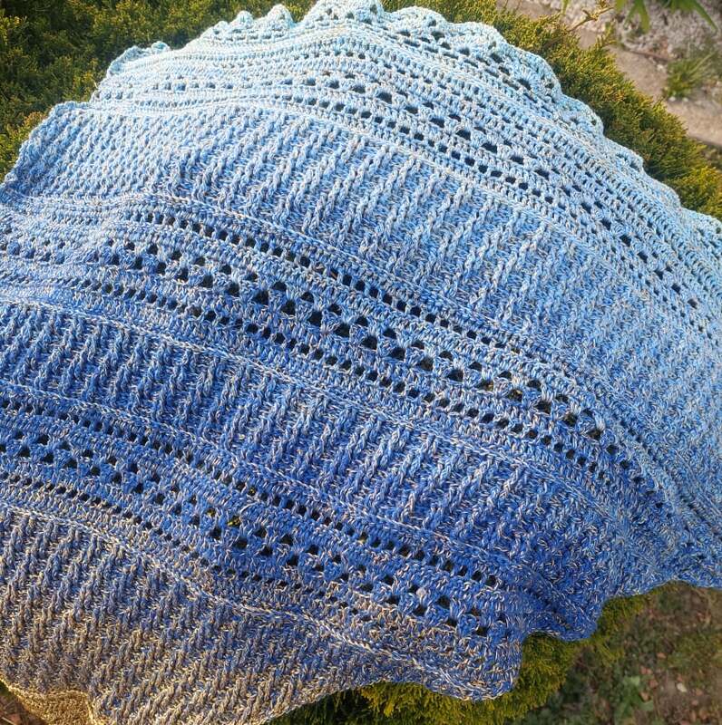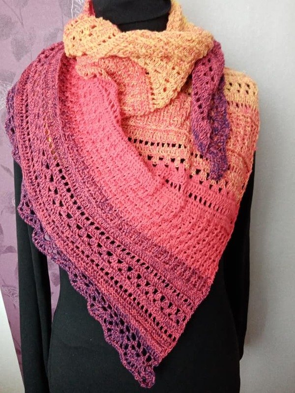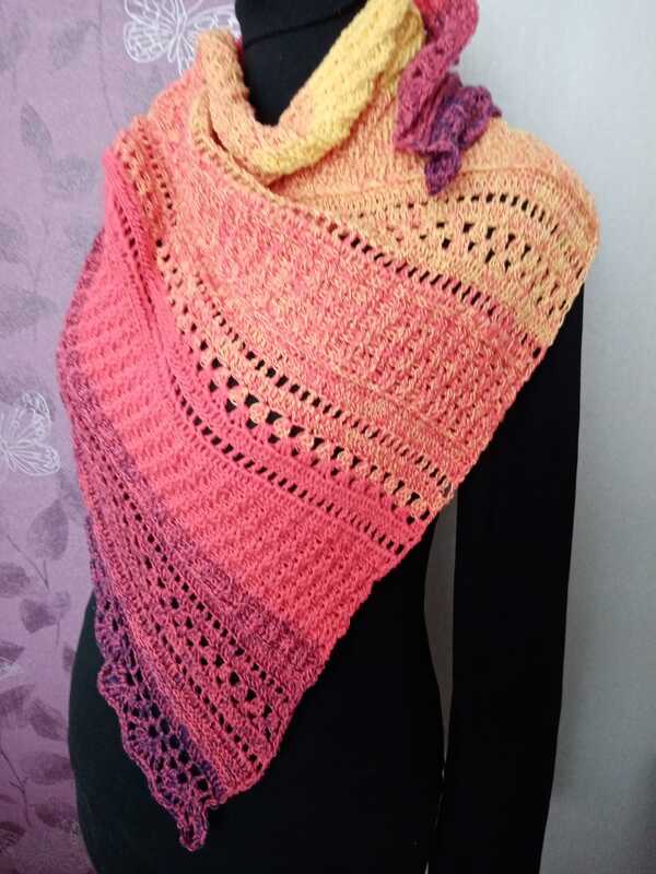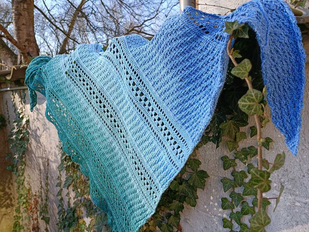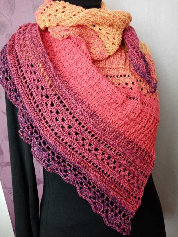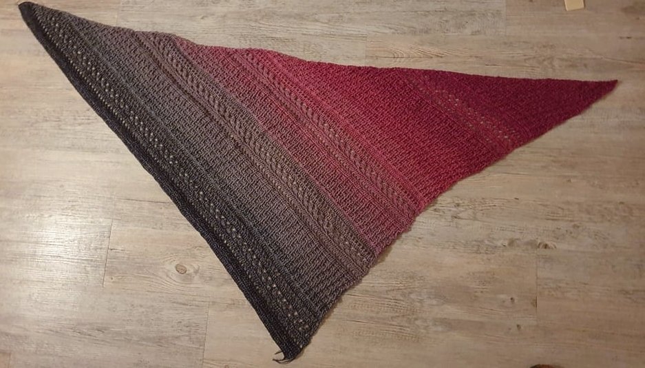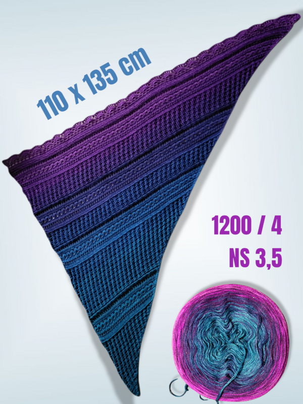 Mit einem Farbverlaufsbobbel, 3 fädig, 1000 mLL und einer NS von 3 verarbeitet, wird das Tuch ca. 1,50 breit und 95 cm tief.