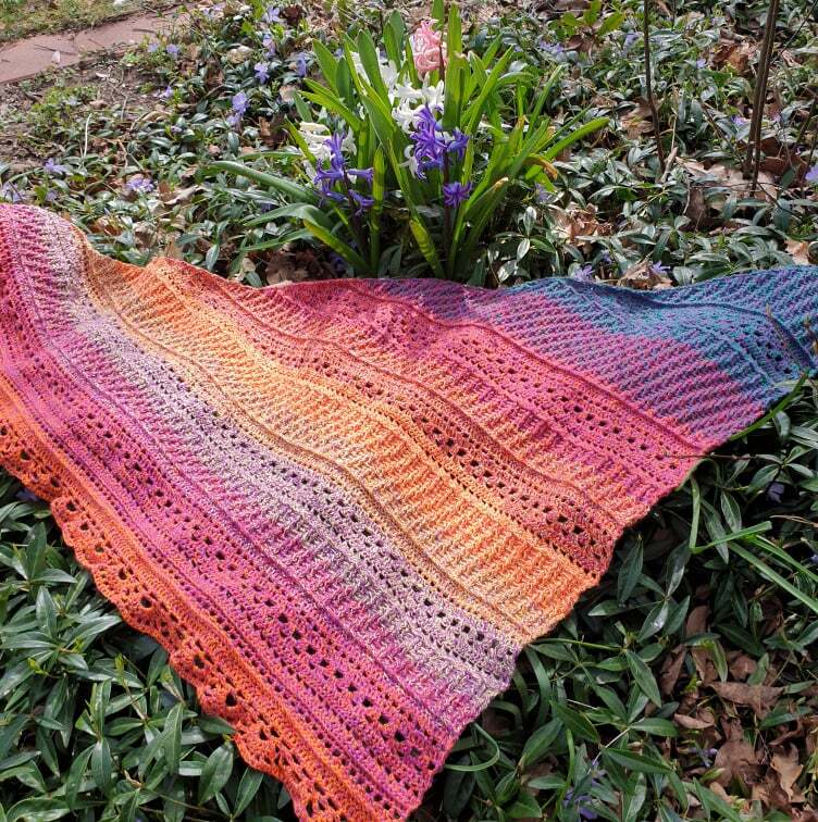 Für das Tuch im Titelbild wurde ein Farbverlaufsbobbel, 4 fädig, 1200 mLL mit einer NS von 3,5 verarbeitet.