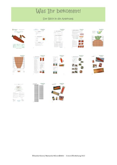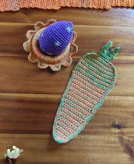 Mit dieser Häkelanleitung könnt ihr euch den im Artikelbild gezeigte Tischläufer sowie die Möhrenuntersetzer und Dekoringe zaubern.