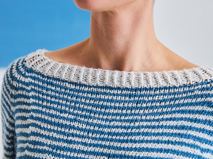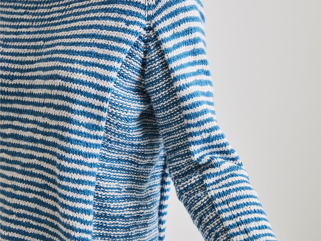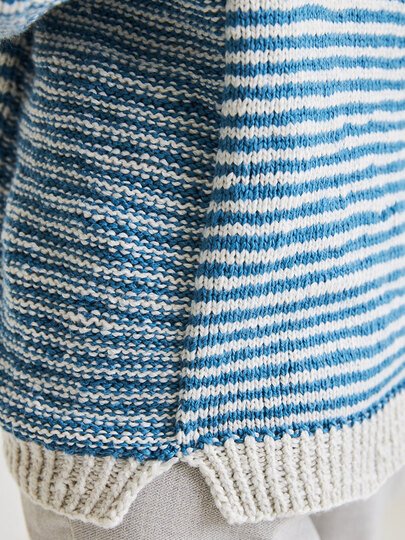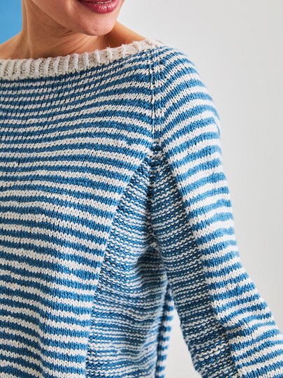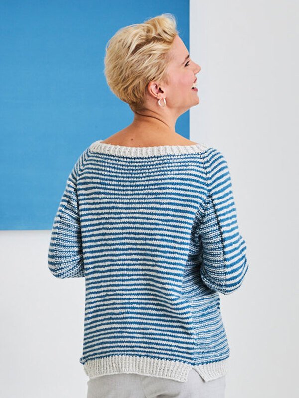 So ein schöner Pulli ist für das ganze jahr über ein perfekter Begleitet. Die feinen Streifen sind glatt rechts gestrickt, bis auf ein kleines witzigen Detail... seht euch einmal die Seiten und die Ärmel an. Da wechselt das Muster zu glatt links und ergibt so diesen total einfachen, aber genialen Effekt. Das Material ist eine sehr edle Mischung mit einem hohen Cashmere Anteil, es ist die Woolly Hugs Cashmere+.