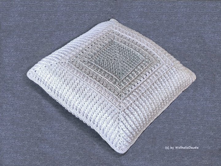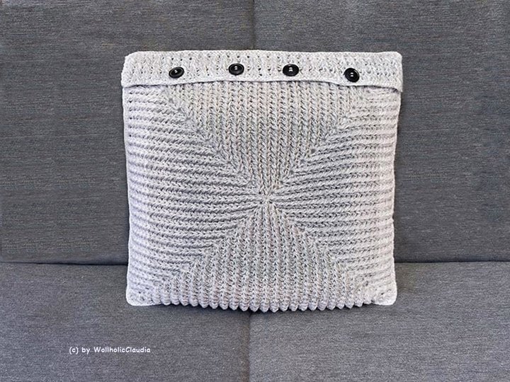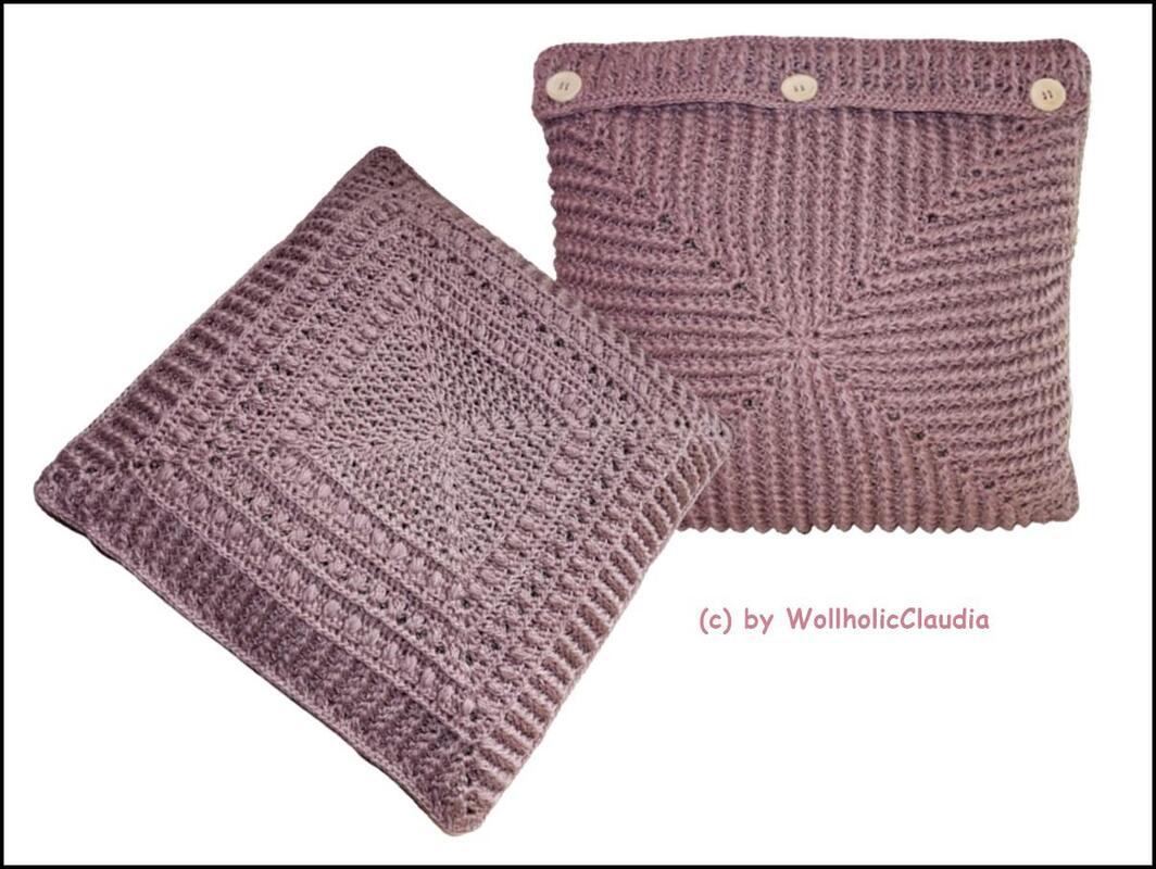 Hier hat man die Möglichkeit, 2 unterschiedliche Musterseiten zu gestalten oder beide Kissenhälften identisch zu arbeiten. Geschlossen werden sie mit einer Knopfleiste, die man beliebig lang machen kann.