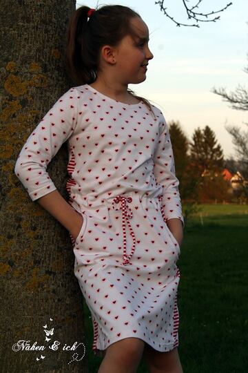 Helma ist ein Kleid, das keine Wünsche offen lässt: Du kannst es vorne und/oder hinten mit einem raffinierten Schlitz nähen oder ohne, du kannst Helma mit Taschen oder ohne nähen, du hast die Möglichkeit einen Tunnel aufzunähen, außerdem kannst du Helma auch aus einem Ober- und einem Rockteil nähen und sie mit einem Gummi raffen. Natürlich ist auch ein ganz schlichtes Kleid oder Shirt möglich. Du siehst, du hast jede Menge Möglichkeiten mit diesem Schnittmuster.